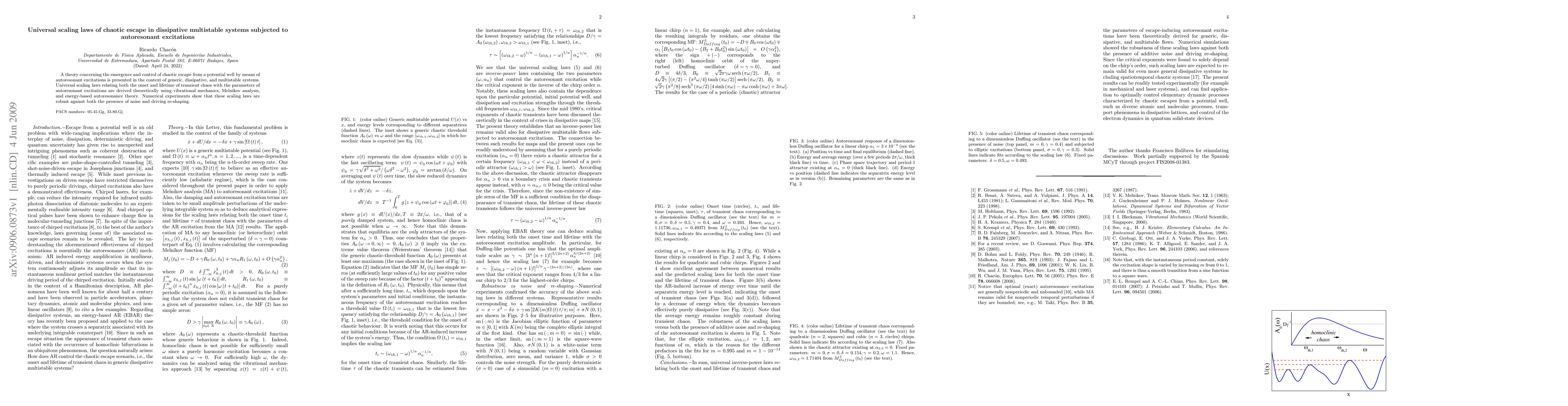 A theory concerning the emergence and control of chaotic escape from a potential well by means of autoresonant excitations is presented in the context of generic, dissipative, and multistable systems. Universal scaling laws relating both the onset and lifetime of transient chaos with the parameters of autoresonant excitations are derived theoretically using vibrational mechanics, Melnikov analysis, and energy-based autoresonance theory. Numerical experiments show that these scaling laws are robust against both the presence of noise and re-shaping.