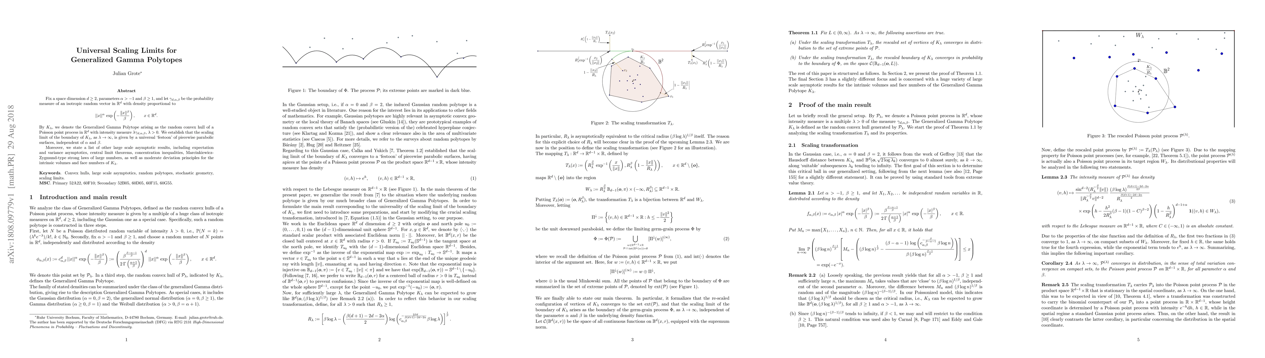 Fix a space dimension $d\ge 2$, parameters $\alpha > -1$ and $\beta \ge 1$, and let $\gamma_{d,\alpha, \beta}$ be the probability measure of an isotropic random vector in $\mathbb{R}^d$ with density proportional to \begin{align*} ||x||^\alpha\, \exp\left(-\frac{\|x\|^\beta}{\beta}\right), \qquad x\in \mathbb{R}^d. \end{align*} By $K_\lambda$, we denote the Generalized Gamma Polytope arising as the random convex hull of a Poisson point process in $\mathbb{R}^d$ with intensity measure $\lambda\gamma_{d,\alpha,\beta}$, $\lambda>0$. We establish that the scaling limit of the boundary of $K_\lambda$, as $\lambda \rightarrow \infty$, is given by a universal `festoon' of piecewise parabolic surfaces, independent of $\alpha$ and $\beta$. Moreover, we state a list of other large scale asymptotic results, including expectation and variance asymptotics, central limit theorems, concentration inequalities, Marcinkiewicz-Zygmund-type strong laws of large numbers, as well as moderate deviation principles for the intrinsic volumes and face numbers of $K_\lambda$.