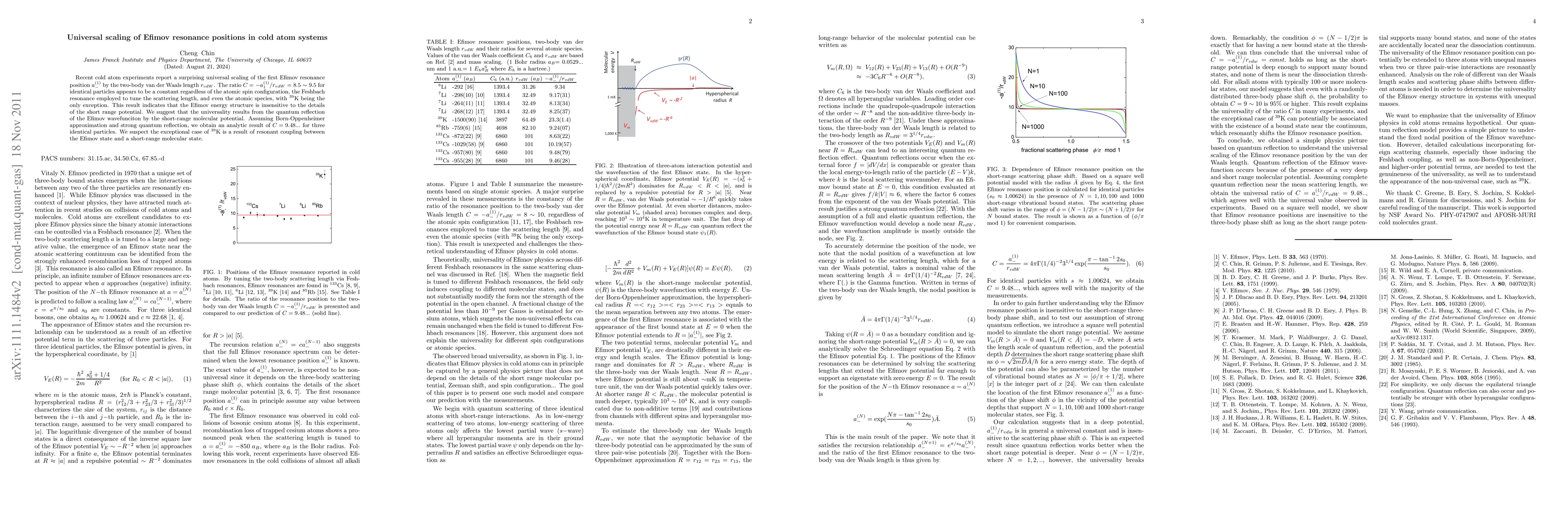 This research reveals a universal scaling of the first Efimov resonance position by the two-body van der Waals length in cold atom systems, indicating that the Efimov energy structure is largely independent of specific atomic details. The ratio C=-a_{-}^1/r_{vdW} remains constant across various atomic species and configurations, except for K-39, which may be due to resonant coupling with a short-range molecular state.