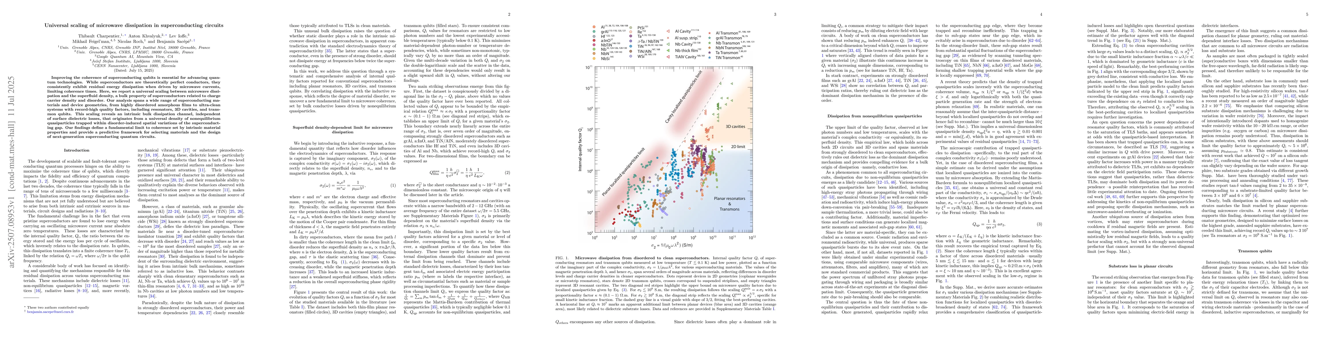 The paper introduces a universal scaling model linking microwave dissipation to superfluid density, providing insights into the intrinsic dissipation mechanisms in superconducting circuits.