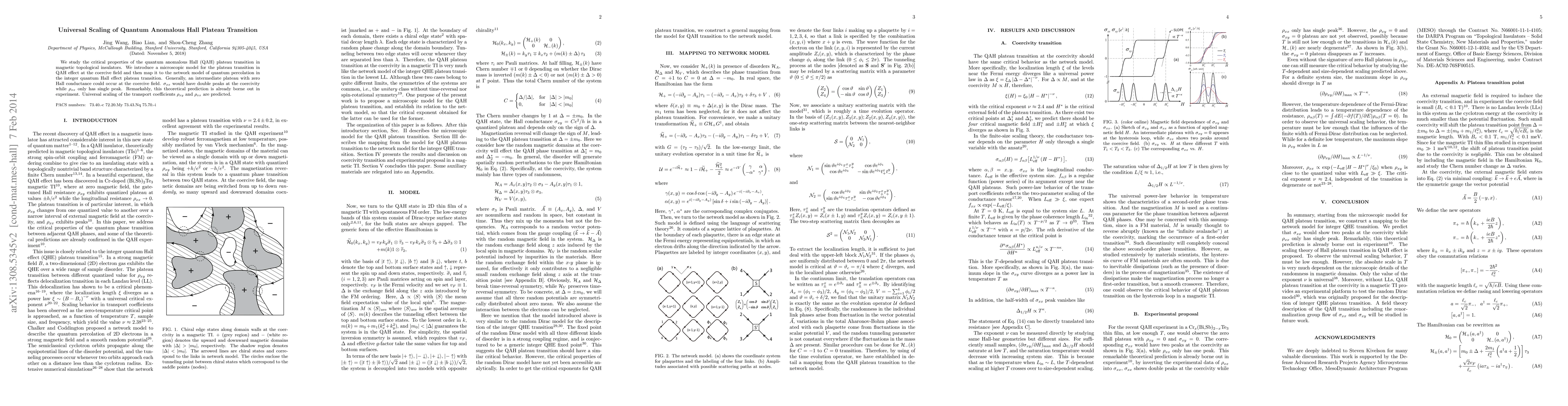 The paper investigates the critical behavior of the quantum anomalous Hall (QAH) plateau transition in magnetic topological insulators, predicting universal scaling of transport coefficients and experimental verification of double peaks in $\sigma_{xx}$ and a single peak in $\rho_{xx}$ at coercive field.