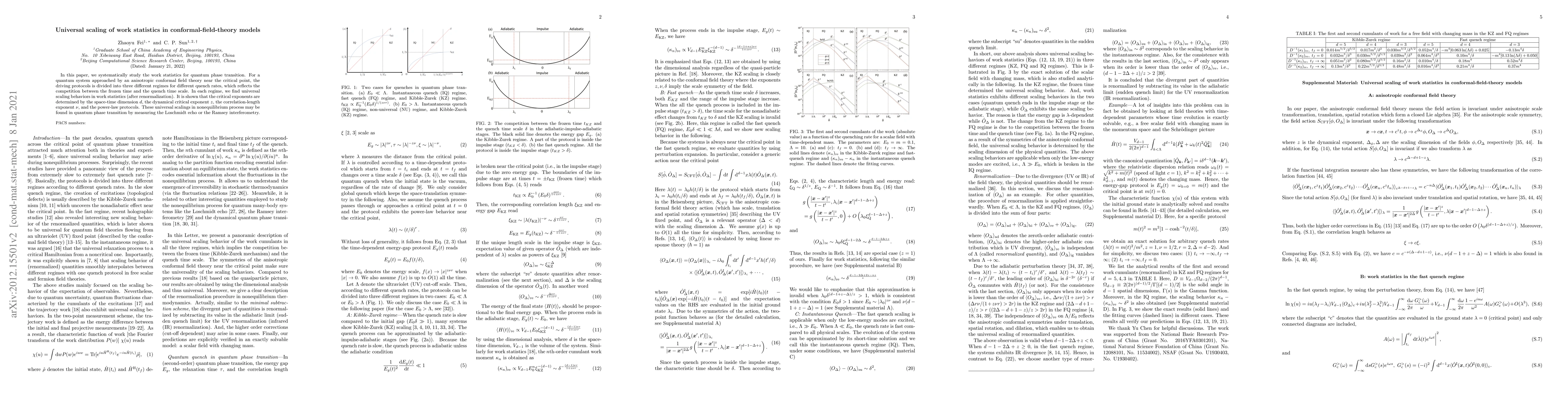 In this paper, we systematically study the work statistics for quantum phase transition. For a quantum system approached by an anisotropic conformal field theory near the critical point, the driving protocols is divided into three different regimes for different quench rates, which reflects the competition between the frozen time and the quench time scale. In each regime, we find universal scaling behaviors in work statistics (after renormalization). It is shown that the critical exponents are determined by the space-time dimension $d$, the dynamical critical exponent $z$, the correlation-length exponent $\nu$, and the power-law protocols. These universal scalings in nonequilibrium process may be found in quantum phase transition by measuring the Loschmidt echo or the Ramsey interferometry.