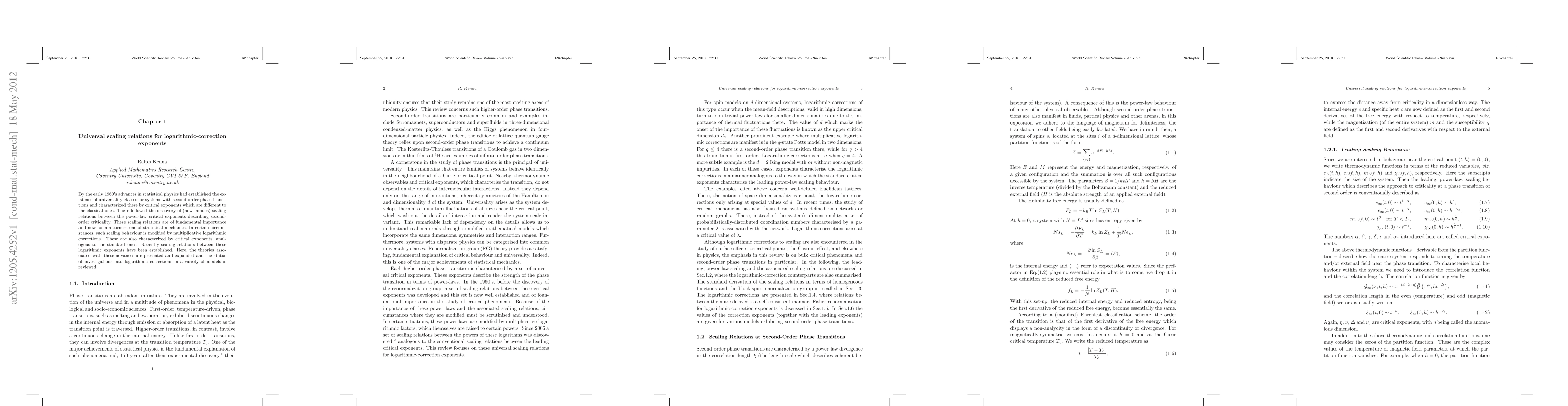 Researchers explore scaling relations for logarithmic-correction exponents in second-order phase transitions, revealing new insights into fundamental statistical mechanics principles. They present theories and review investigations into these corrections in various models.