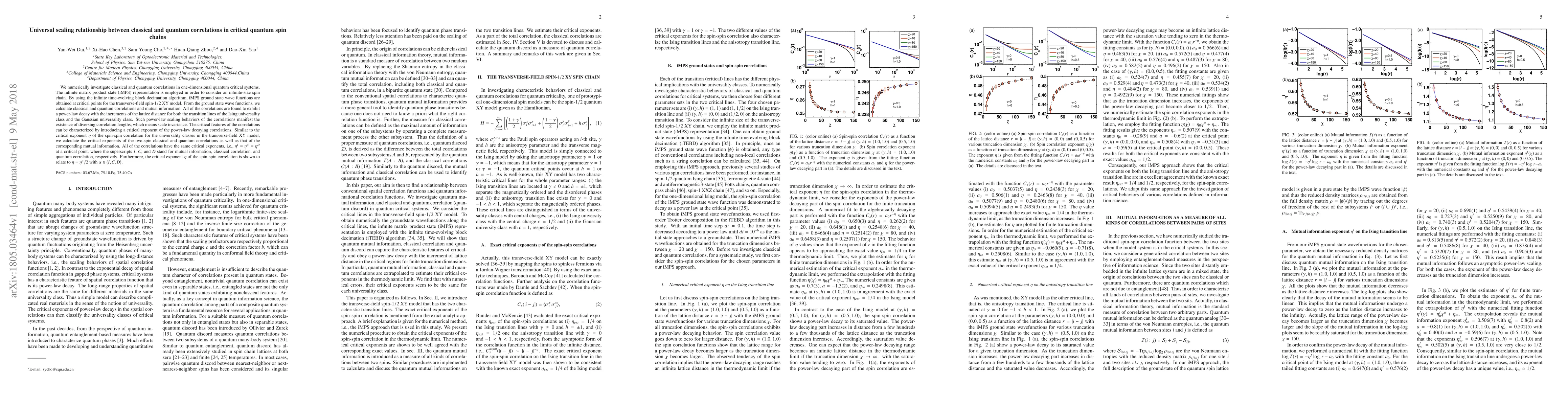 This paper investigates the universal scaling relationship between classical and quantum correlations in critical quantum spin chains using numerical methods. It finds that both types of correlations exhibit power-law decay with the same critical exponents at critical points, indicating scale invariance and a universal scaling behavior.