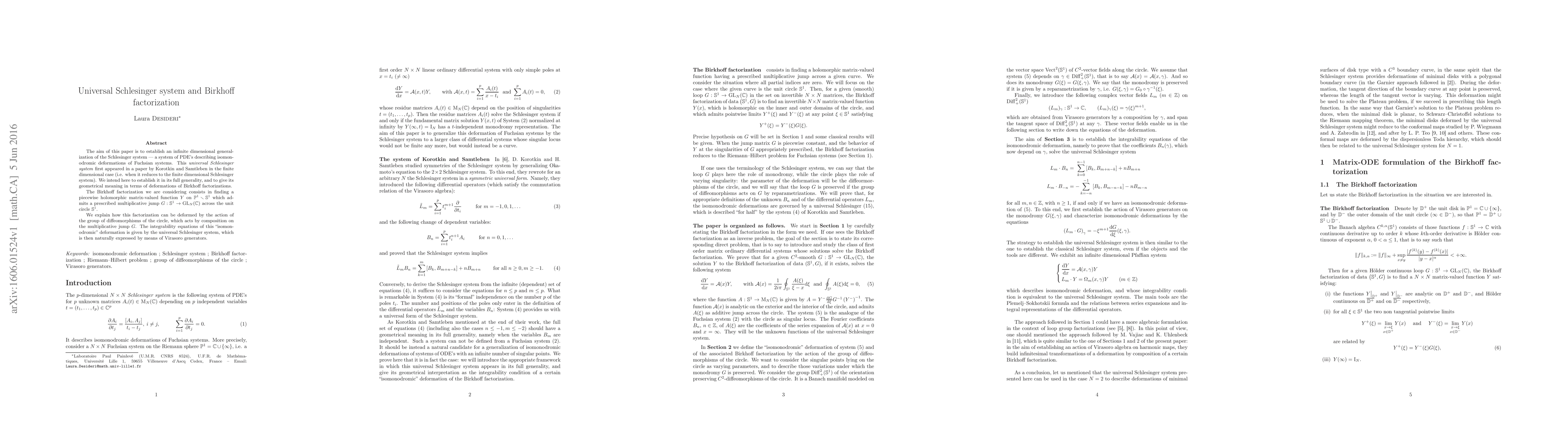 The aim of this paper is to establish an infinite dimensional generalization of the Schlesinger system -- a system of PDE's describing isomonodromic deformations of Fuchsian systems. This universal Schlesinger system first appeared in a paper by Korotkin and Samtleben in the finite dimensional case (i.e. when it reduces to the finite dimensional Schlesinger system). We intend here to establish it in its full generality, and to give its geometrical meaning in terms of deformations of Birkhoff factorizations. The Birkhoff factorization we are considering consists in finding a piecewise holomorphic matrix-valued function $Y$ on $\mathbb P^1\smallsetminus\mathbb S^1$ which admits a prescribed multiplicative jump $G : \mathbb S^1\to \text{GL}_N(\mathbb C)$ across the unit circle $\mathbb S^1$. We explain how this factorization can be deformed by the action of the group of diffeomorphisms of the circle, which acts by composition on the multiplicative jump $G$. The integrability equations of this "isomonodromic" deformation is given by the universal Schlesinger system, which is then naturally expressed by means of Virasoro generators.