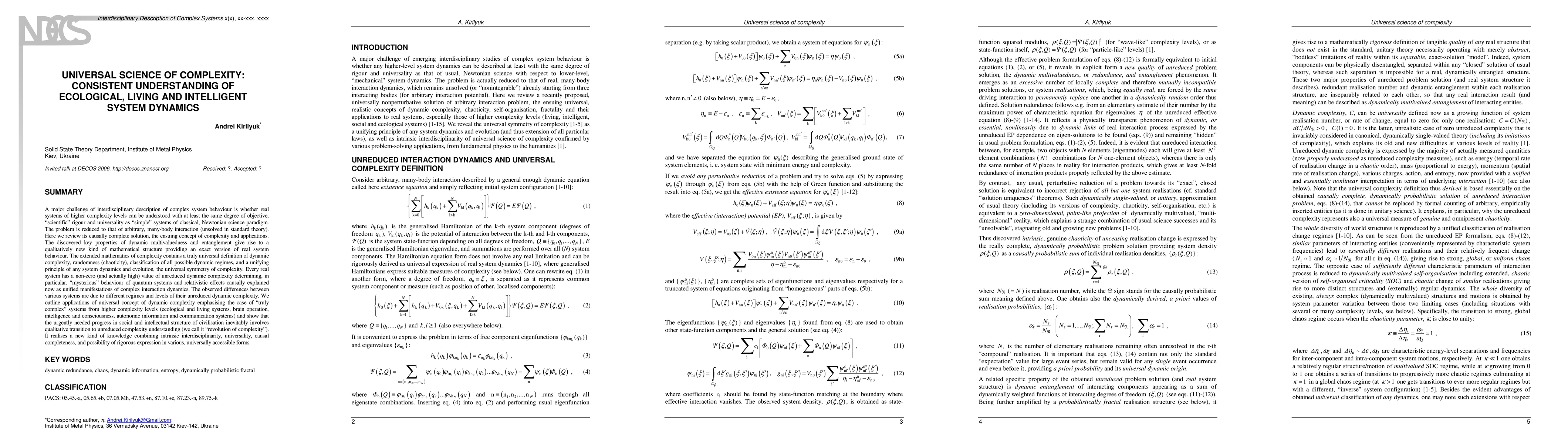 A major challenge of interdisciplinary description of complex system behaviour is whether real systems of higher complexity levels can be understood with at least the same degree of objective, "scientific" rigour and universality as "simple" systems of classical, Newtonian science paradigm. The problem is reduced to that of arbitrary, many-body interaction (unsolved in standard theory). Here we review its causally complete solution, the ensuing concept of complexity and applications. The discovered key properties of dynamic multivaluedness and entanglement give rise to a qualitatively new kind of mathematical structure providing the exact version of real system behaviour. The extended mathematics of complexity contains the truly universal definition of dynamic complexity, randomness (chaoticity), classification of all possible dynamic regimes, and the unifying principle of any system dynamics and evolution, the universal symmetry of complexity. Every real system has a non-zero (and actually high) value of unreduced dynamic complexity determining, in particular, "mysterious" behaviour of quantum systems and relativistic effects causally explained now as unified manifestations of complex interaction dynamics. The observed differences between various systems are due to different regimes and levels of their unreduced dynamic complexity. We outline applications of universal concept of dynamic complexity emphasising cases of "truly complex" systems from higher complexity levels (ecological and living systems, brain operation, intelligence and consciousness, autonomic information and communication systems) and show that the urgently needed progress in social and intellectual structure of civilisation inevitably involves qualitative transition to unreduced complexity understanding (we call it "revolution of complexity").