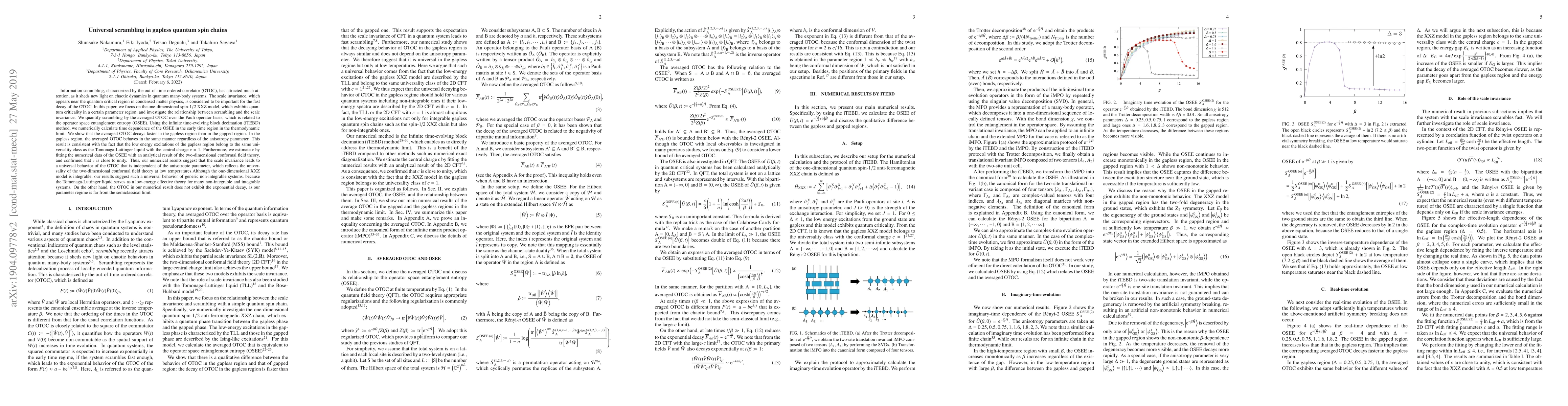 This research investigates scrambling in the one-dimensional spin-1/2 XXZ model, focusing on the relationship between scrambling and scale invariance. Using the iTEBD method, the study reveals that the averaged out-of-time-ordered correlator (OTOC) decays faster in the gapless region than in the gapped region. The findings suggest that low-energy excitations in the gapless region align with the Tomonaga-Luttinger liquid's universality class (c=1), confirming scale invariance's importance in the universal behavior of the OTOC.
