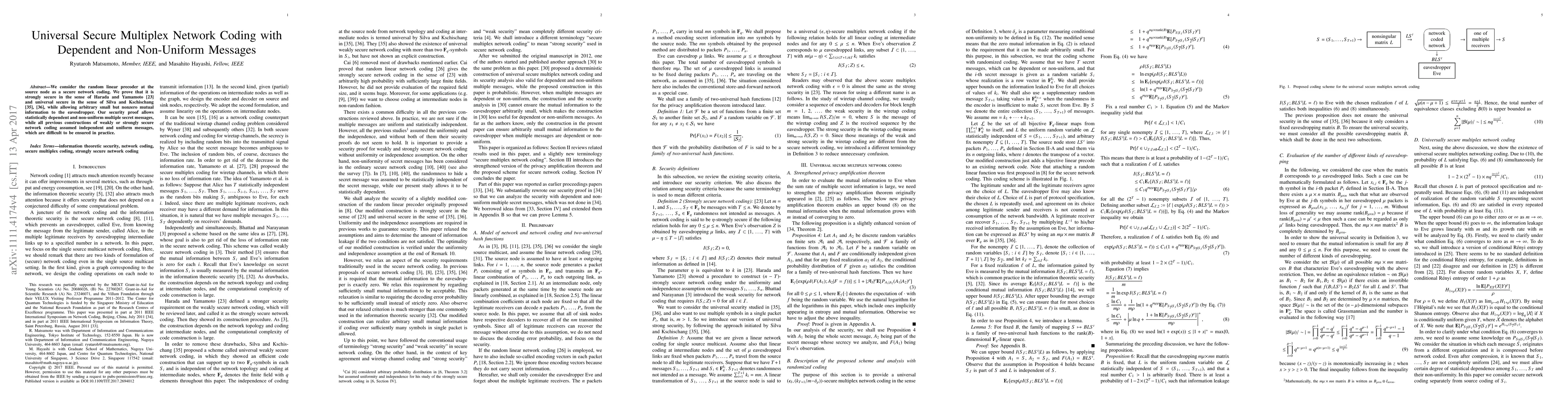 We consider the random linear precoder at the source node as a secure network coding. We prove that it is strongly secure in the sense of Harada and Yamamoto and universal secure in the sense of Silva and Kschischang, while allowing arbitrary small but nonzero mutual information to the eavesdropper. Our security proof allows statistically dependent and non-uniform multiple secret messages, while all previous constructions of weakly or strongly secure network coding assumed independent and uniform messages, which are difficult to be ensured in practice.
