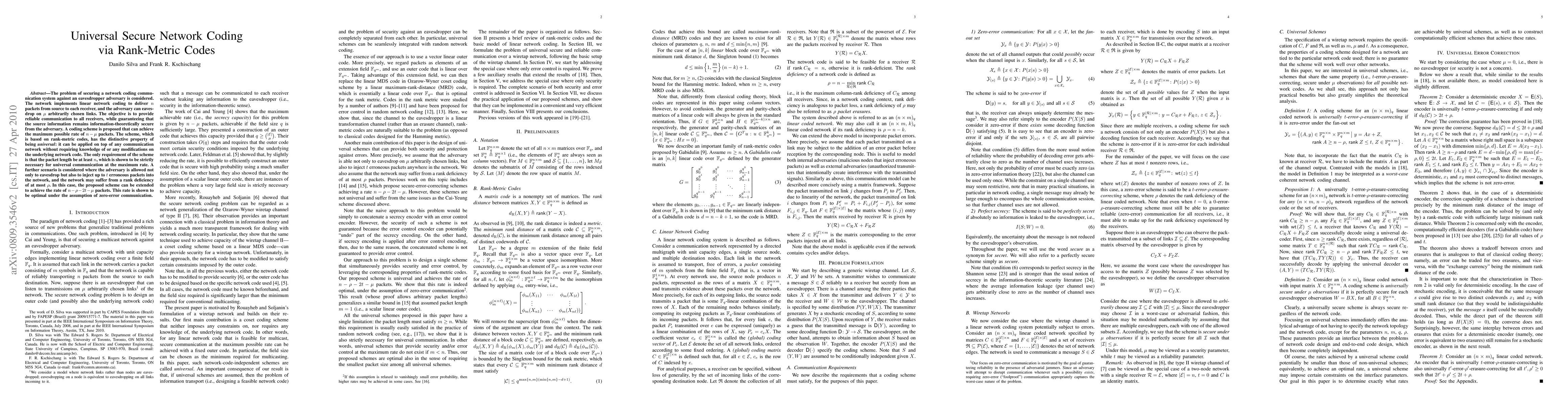 This paper proposes a universal secure network coding scheme using rank-metric codes to ensure information-theoretical security against an eavesdropper, achieving the maximum rate of n-\mu packets. The scheme is adaptable to any network without modifications and can also handle adversarial packet injection and network rank deficiency.