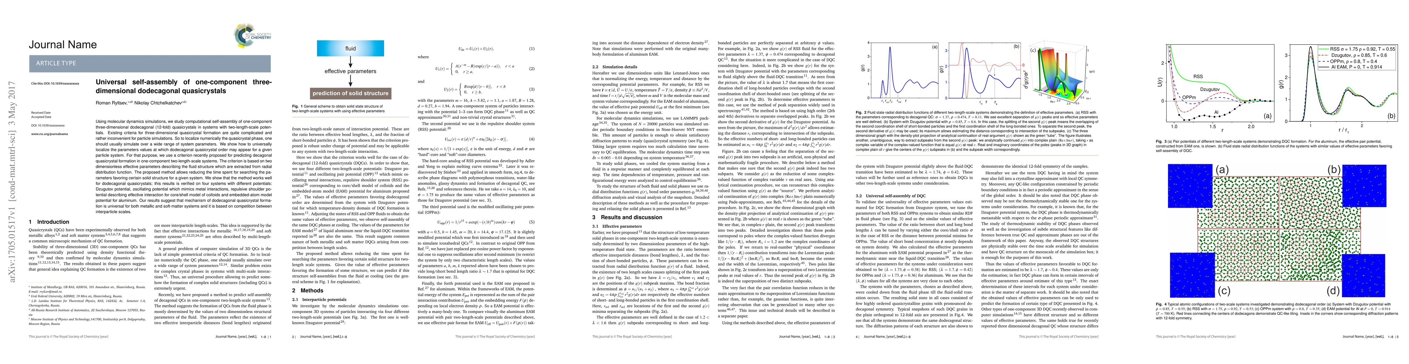 This paper presents a computational method for the self-assembly of one-component three-dimensional dodecagonal quasicrystals using molecular dynamics simulations. The authors propose a universal criterion based on two dimensionless parameters to efficiently locate the conditions favoring quasicrystal formation, validated across four different potential systems.
