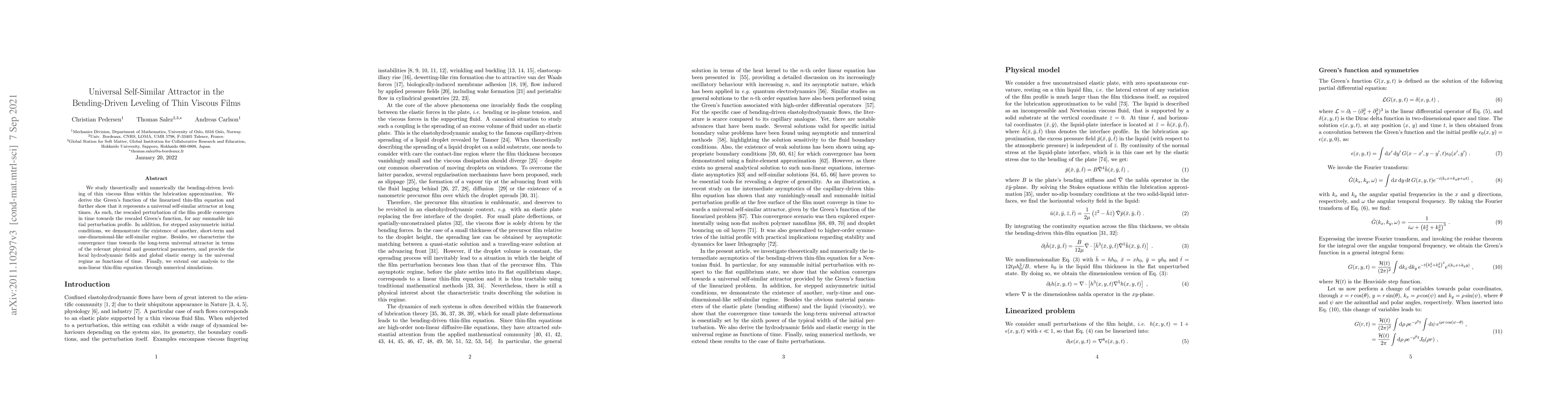 This paper investigates the bending-driven leveling of thin viscous films, revealing a universal self-similar attractor in the long-term behavior. It also identifies a short-term, one-dimensional self-similar regime for specific initial conditions and provides insights into the convergence time and energy characteristics.
