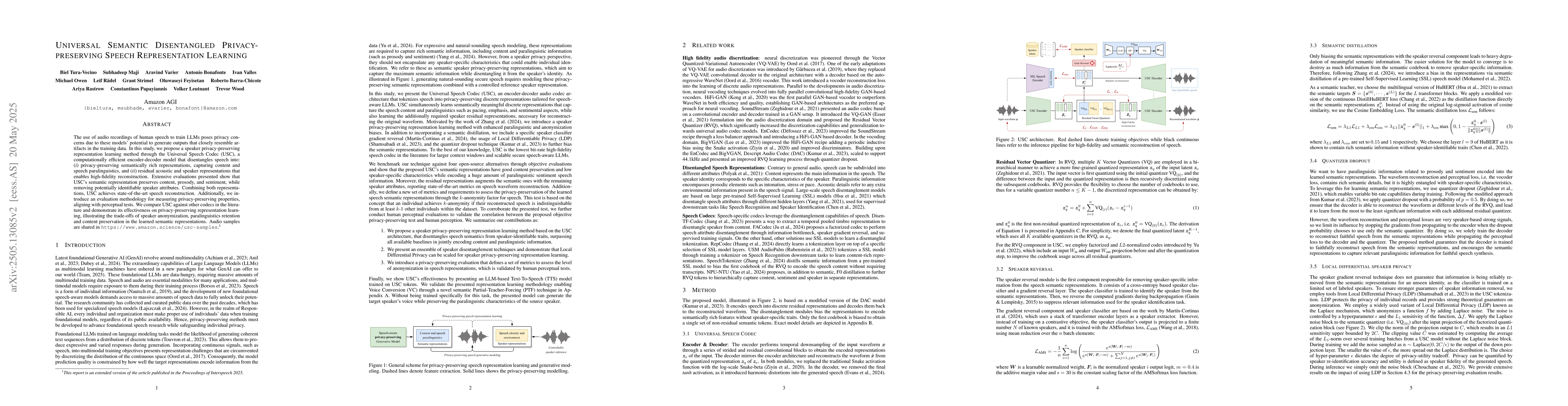 A new speech codec called USC achieves state-of-the-art speech reconstruction while removing identifiable speaker attributes, preserving content and paralinguistics.