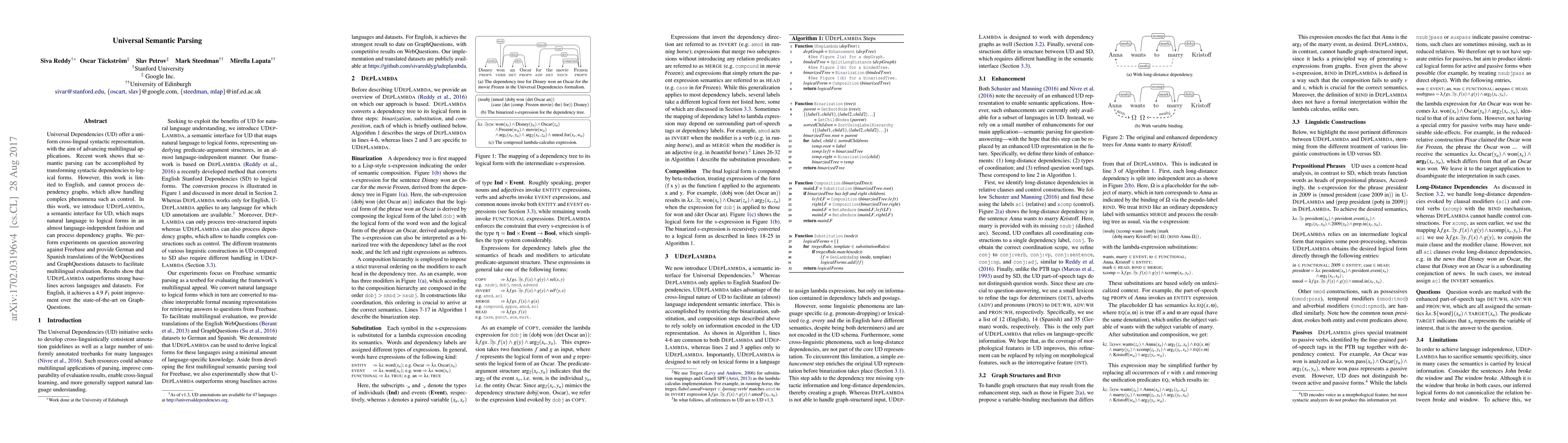 This paper introduces UDepLambda, a semantic parsing interface for Universal Dependencies that translates natural language into logical forms in a nearly language-independent manner, capable of processing complex syntactic structures. Experiments on multilingual question answering show UDepLambda's superior performance over existing methods, achieving a notable F1 improvement for English on GraphQuestions.