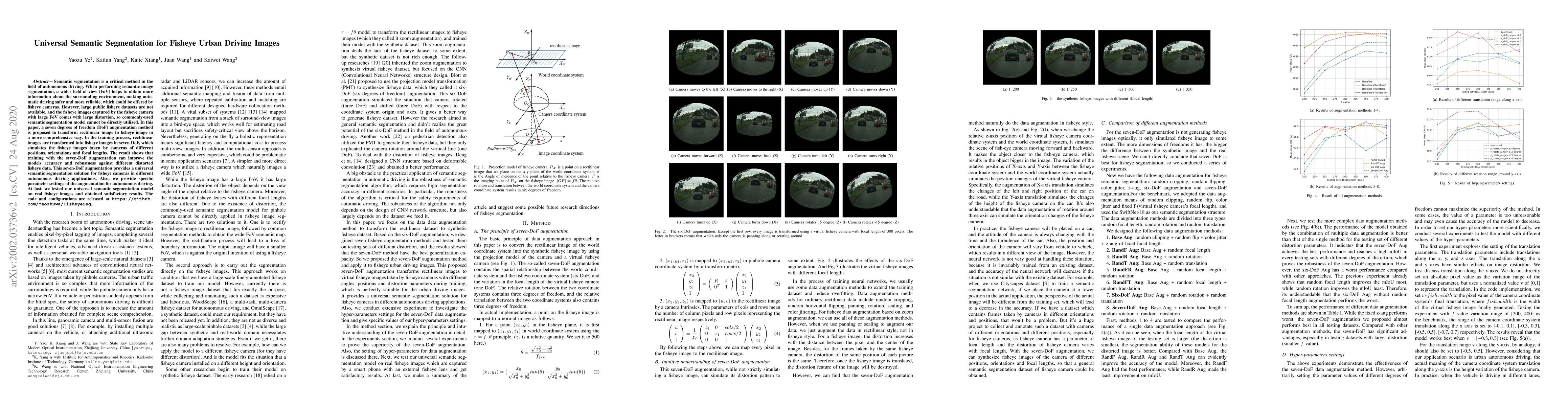 This paper proposes a seven degrees of freedom augmentation method to transform rectilinear images into fisheye images, enhancing the training of semantic segmentation models for fisheye urban driving images. The method improves model accuracy and robustness, providing a universal solution for autonomous driving applications.