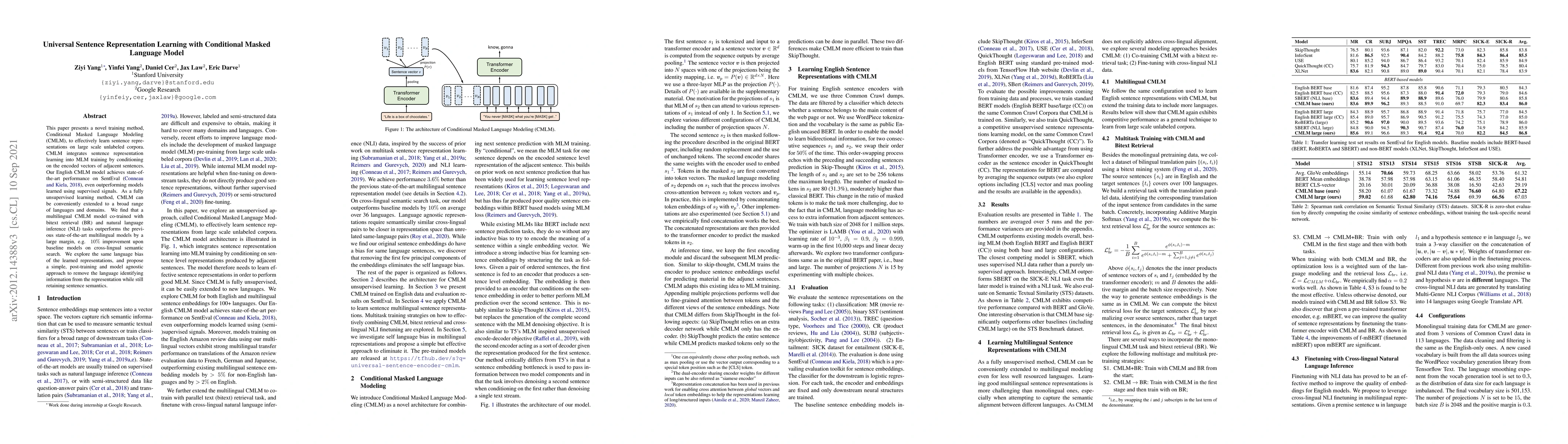 This paper presents a novel training method, Conditional Masked Language Modeling (CMLM), to effectively learn sentence representations on large scale unlabeled corpora. CMLM integrates sentence representation learning into MLM training by conditioning on the encoded vectors of adjacent sentences. Our English CMLM model achieves state-of-the-art performance on SentEval, even outperforming models learned using supervised signals. As a fully unsupervised learning method, CMLM can be conveniently extended to a broad range of languages and domains. We find that a multilingual CMLM model co-trained with bitext retrieval (BR) and natural language inference (NLI) tasks outperforms the previous state-of-the-art multilingual models by a large margin, e.g. 10% improvement upon baseline models on cross-lingual semantic search. We explore the same language bias of the learned representations, and propose a simple, post-training and model agnostic approach to remove the language identifying information from the representation while still retaining sentence semantics.
