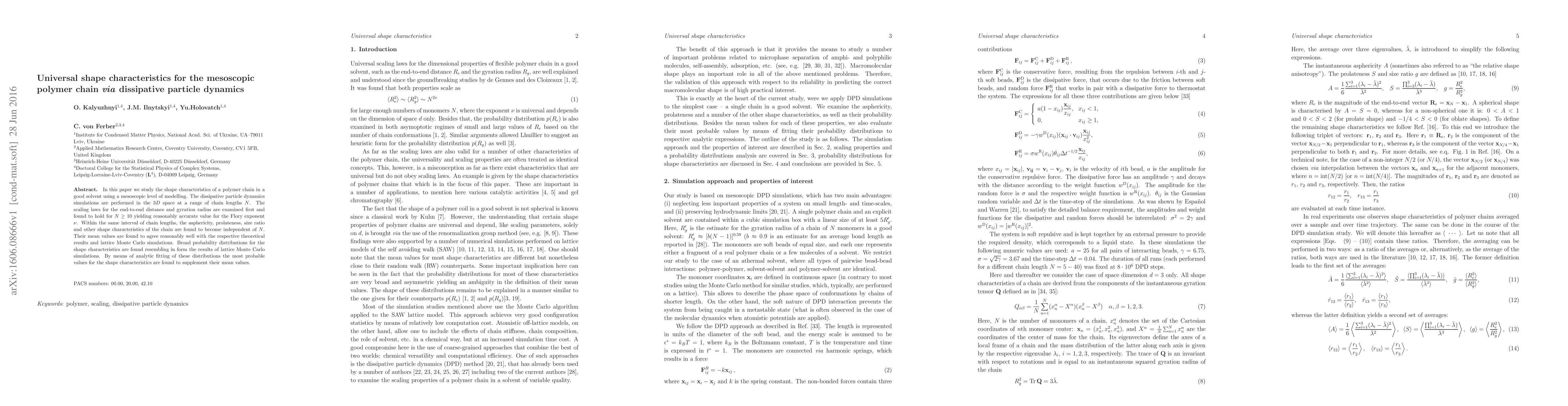 This paper uses dissipative particle dynamics simulations to study the shape characteristics of polymer chains in good solvent conditions at mesoscopic levels, finding that scaling laws and shape characteristics become independent of chain length for $N\geq 10$, with results agreeing with theoretical and lattice Monte Carlo simulations.
