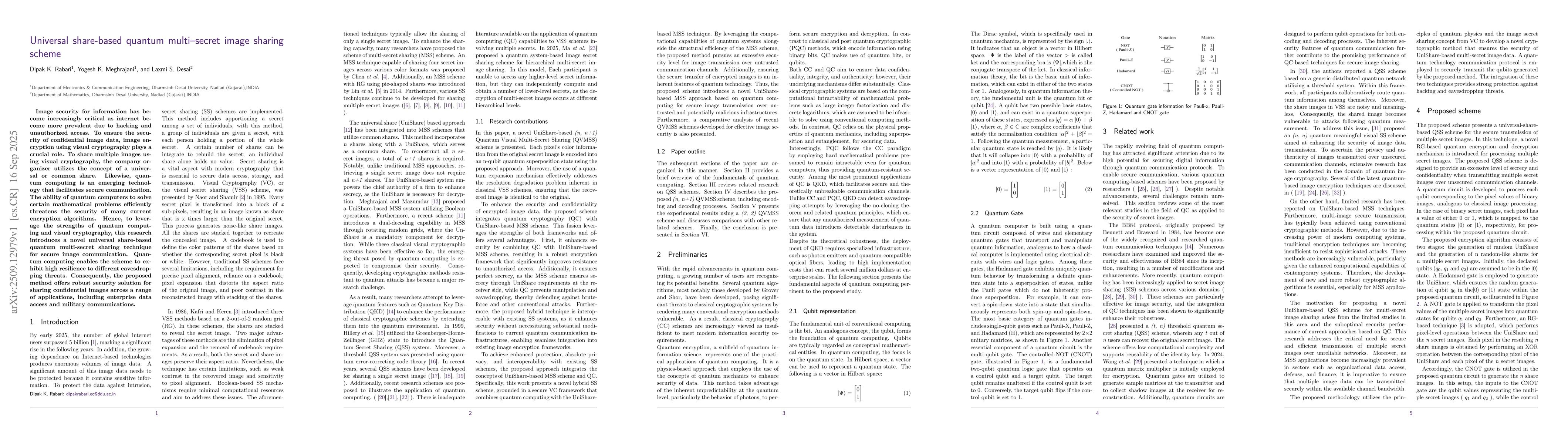 The research proposes a universal share-based quantum multi-secret image sharing scheme that integrates quantum computing principles with visual cryptography. It utilizes quantum gates (Hadamard, CNOT) and quantum states (|0⟩, |1⟩) to encrypt and decrypt multiple secret images through a quantum circuit. The methodology involves generating random UniShares and encrypted shares using quantum operations, followed by lossless reconstruction at the receiver end using quantum measurement and classical bit conversion.