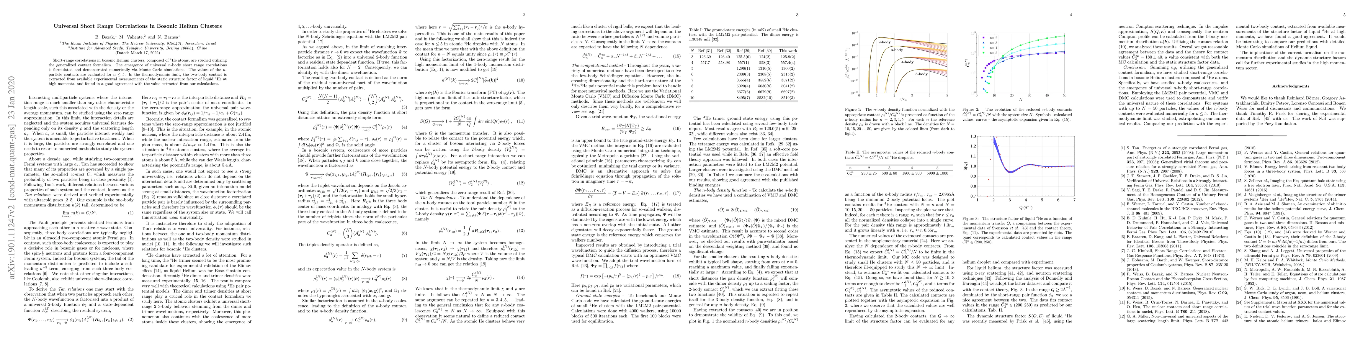 This research uses the generalized contact formalism to study short-range correlations in bosonic Helium clusters. It numerically demonstrates universal n-body short-range correlations for n≤5, aligning the two-body contact value with experimental data from liquid $^4$He static structure factor measurements.