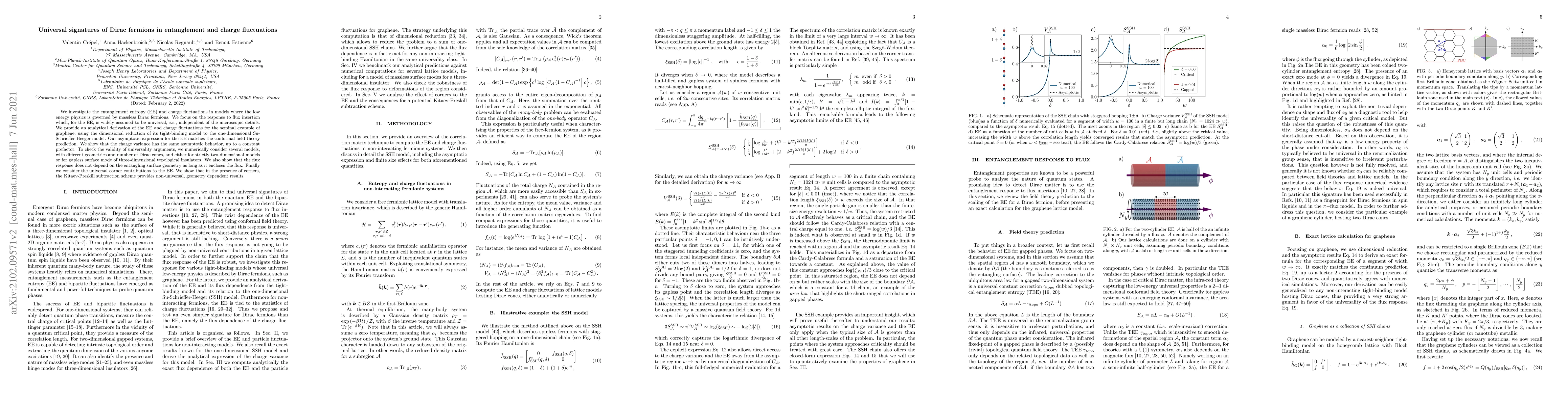 We investigate the entanglement entropy (EE) and charge fluctuations in models where the low energy physics is governed by massless Dirac fermions. We focus on the response to flux insertion which, for the EE, is widely assumed to be universal, \emph{i.e.}, independent of the microscopic details. We provide an analytical derivation of the EE and charge fluctuations for the seminal example of graphene, using the dimensional reduction of its tight-binding model to the one-dimensional Su-Schrieffer-Heeger model. Our asymptotic expression for the EE matches the conformal field theory prediction. We show that the charge variance has the same asymptotic behavior, up to a constant prefactor. To check the validity of universality arguments, we numerically consider several models, with different geometries and number of Dirac cones, and either for strictly two-dimensional models or for gapless surface mode of three-dimensional topological insulators. We also show that the flux response does not depend on the entangling surface geometry as long as it encloses the flux. Finally we consider the universal corner contributions to the EE. We show that in the presence of corners, the Kitaev-Preskill subtraction scheme provides non-universal, geometry dependent results.
