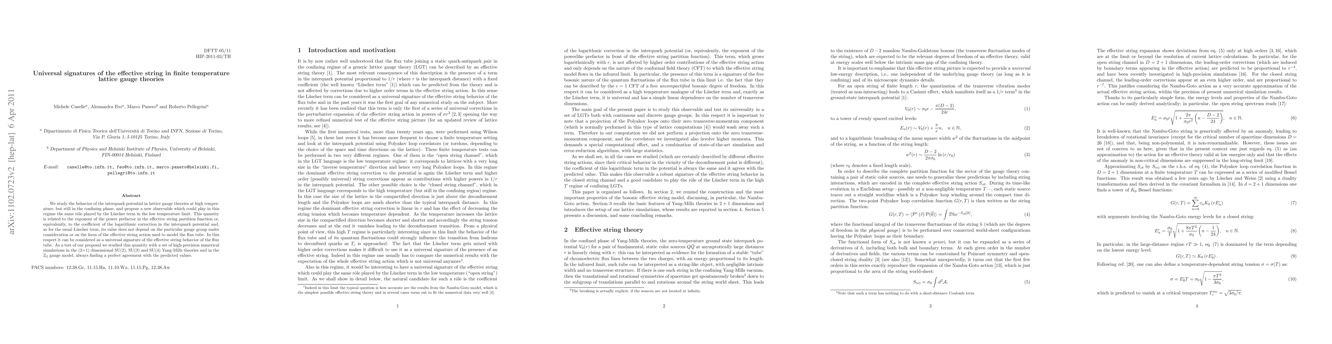 We study the behaviour of the interquark potential in lattice gauge theories at high temperature, but still in the confining phase, and propose a new observable which could play in this regime the same role played by the Luscher term in the low temperature limit. This quantity is related to the exponent of the power prefactor in the effective string partition function or, equivalently, to the coefficient of the logarithmic correction in the interquark potential and, as for the usual Luscher term, its value does not depend on the particular gauge group under consideration or on the form of the effective string action used to model the flux tube. In this respect it can be considered as a universal signature of the effective string behaviour of the flux tube. As a test of our proposal we studied this quantity with a set of high-precision numerical simulations in the (2+1) dimensional SU(2), SU(3) and SU(4) Yang-Mills theories and in the Z_2 gauge model, always finding a perfect agreement with the predicted values.