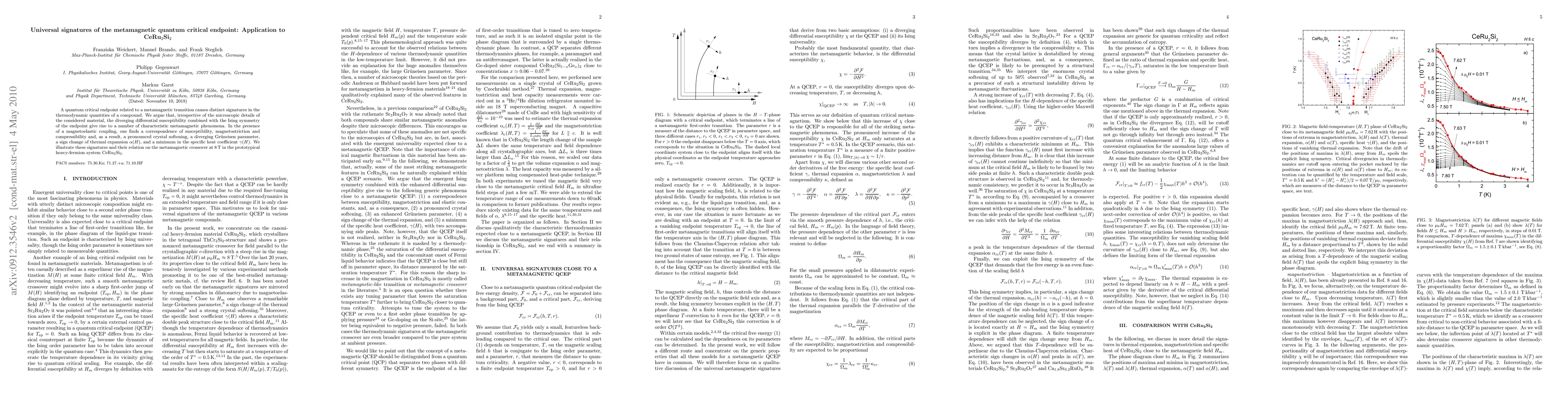 This paper identifies universal signatures of a metamagnetic quantum critical endpoint, emphasizing the diverging differential susceptibility and Ising symmetry. It demonstrates these phenomena in CeRu2Si2, highlighting crystal softening, a diverging Grueneisen parameter, and a sign change in thermal expansion, among other effects.