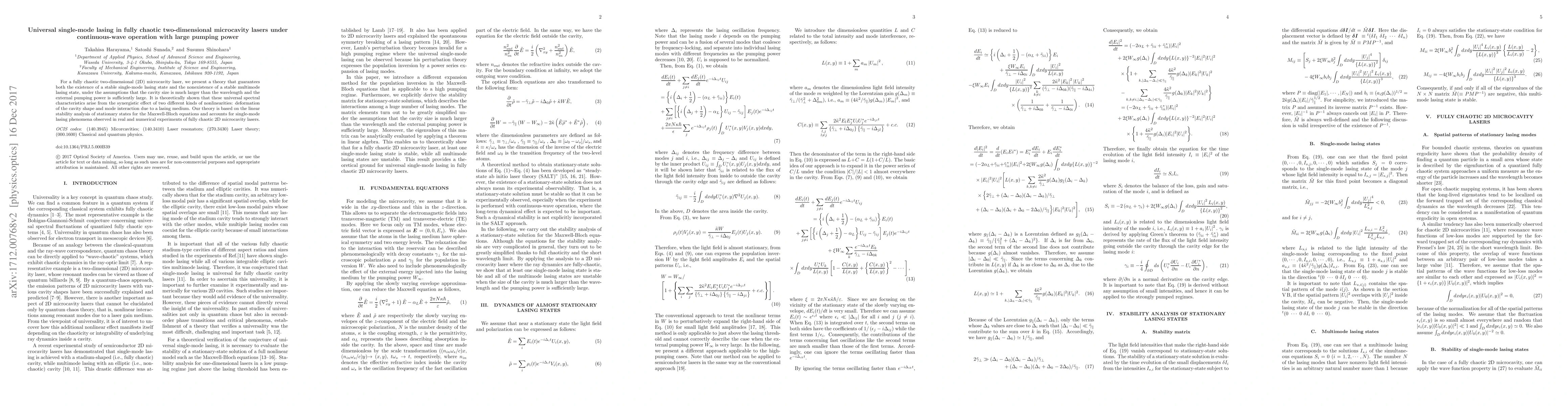 This paper presents a theoretical framework for fully chaotic two-dimensional microcavity lasers that ensures stable single-mode lasing under high pumping power, while preventing multimode lasing. The theory attributes these characteristics to the combined effects of cavity shape deformation and mode interaction within the lasing medium.