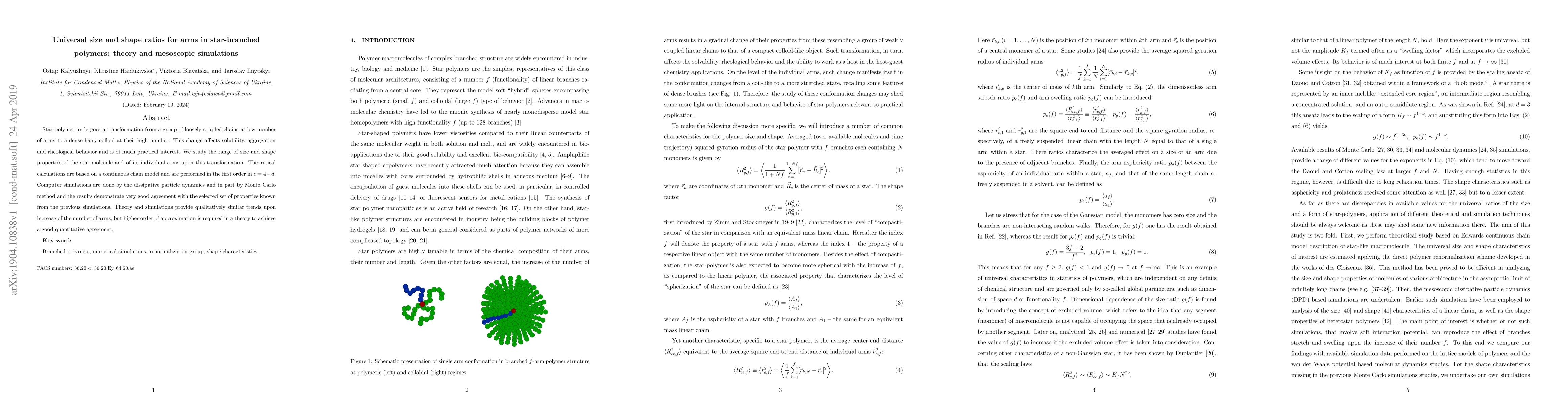 This paper investigates the size and shape ratios of star-branched polymers transitioning from loosely coupled chains to dense colloids, using theoretical calculations and mesoscopic simulations. The study reveals qualitative trends in polymer behavior with arm number, but higher-order approximations are needed for quantitative accuracy.