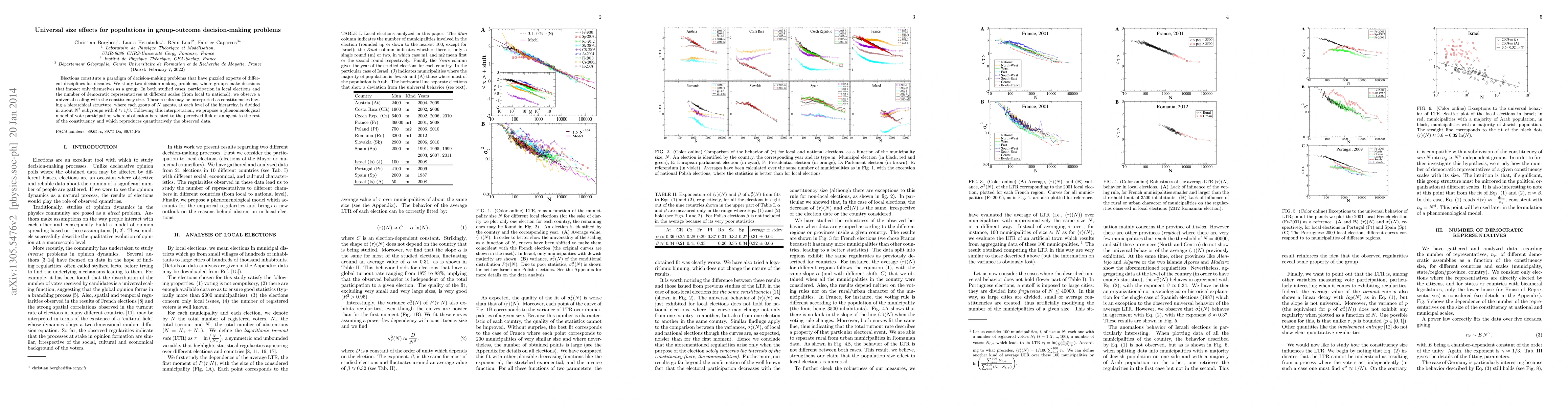 This study reveals a universal scaling relationship in group-outcome decision-making problems, particularly in local elections, where participation scales with constituency size. The findings suggest a hierarchical structure in constituencies, dividing groups into subgroups in a manner where $\delta \approx 1/3$, and propose a model linking abstention to perceived constituency linkage.