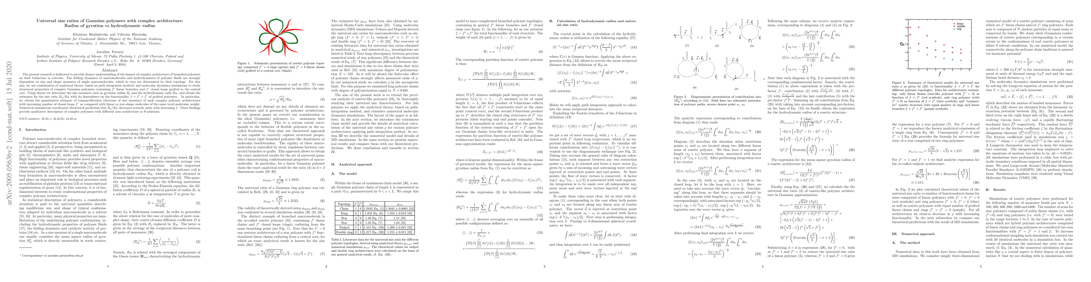 The present research is dedicated to provide deeper understanding of the impact of complex architecture of branched polymers on their behaviour in solvents. The folding dynamics of macromolecules and hydrodynamics of polymer fluids are strongly dependent on size and shape measures of single macromolecules, which in turn are determined by their topology. For this aim, we use combination of analytical theory, based on path integration method, and molecular dynamics simulations to study structural properties of complex Gaussian polymers containing $f^c$ linear branches and $f^r$ closed loops grafted to the central core. Using theory we determine the size measures such as gyration radius $R_g$ and the hydrodynamic radii $R_H$, and obtain the estimates for the size ratio $R_g /R_H$ with its dependence on the functionality $f=f^c+f^r$ of grafted polymers. In particular, we obtain the quantitative estimate of compactification (decrease of size measure) of such complex polymer architectures with increasing number of closed loops $f^r$ as compared with linear or star-shape molecules of the same total molecular weight. Numerical simulations corroborate theoretical prediction that $R_g /R_H$ decreases towards unity with increasing $f$. These findings provide qualitative description of complex polymers with different arm architecture in $\theta$ solutions.
