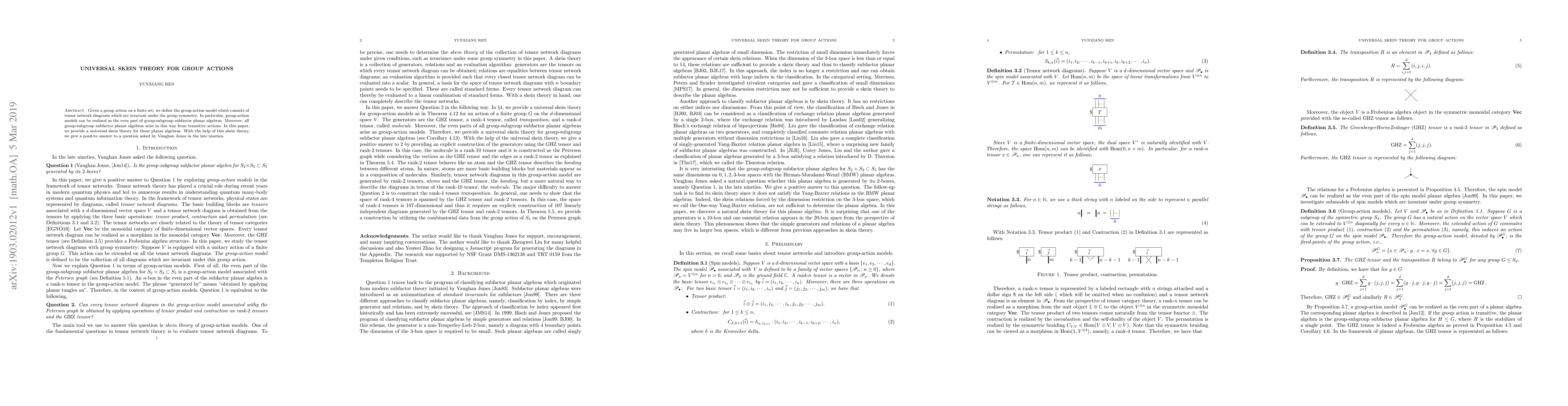 This paper introduces a universal skein theory for group-action models, which are tensor network diagrams invariant under group symmetry, and shows they correspond to the even part of group-subgroup subfactor planar algebras. The authors provide a solution to a question posed by Vaughan Jones regarding these planar algebras.