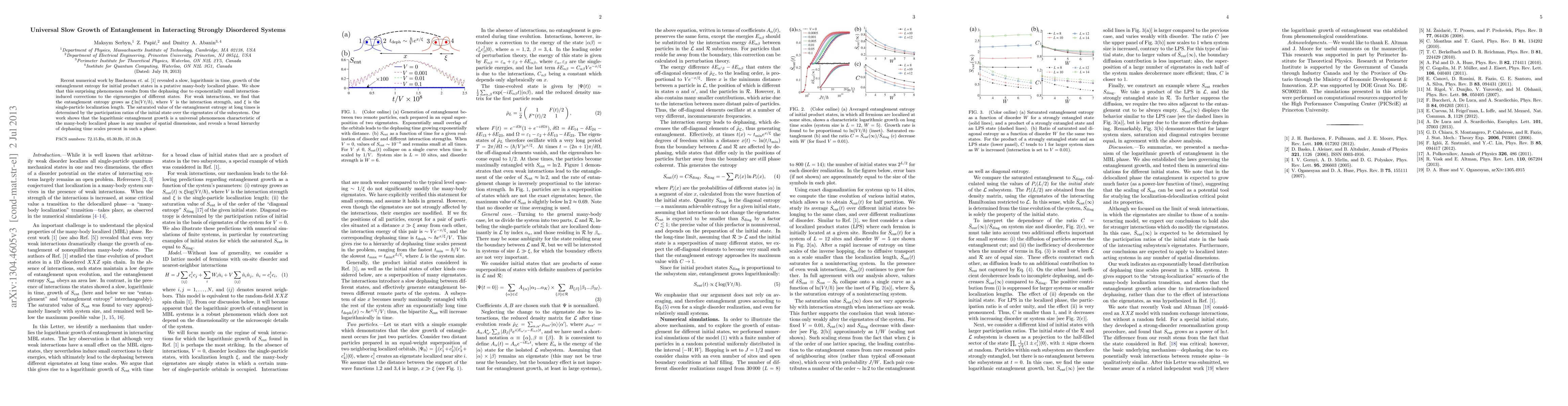 This paper demonstrates that entanglement entropy in strongly disordered systems grows logarithmically over time due to dephasing from interaction-induced corrections, revealing a universal slow growth characteristic of the many-body localized phase. The growth rate depends on the interaction strength and localization length, and is supported by numerical simulations.