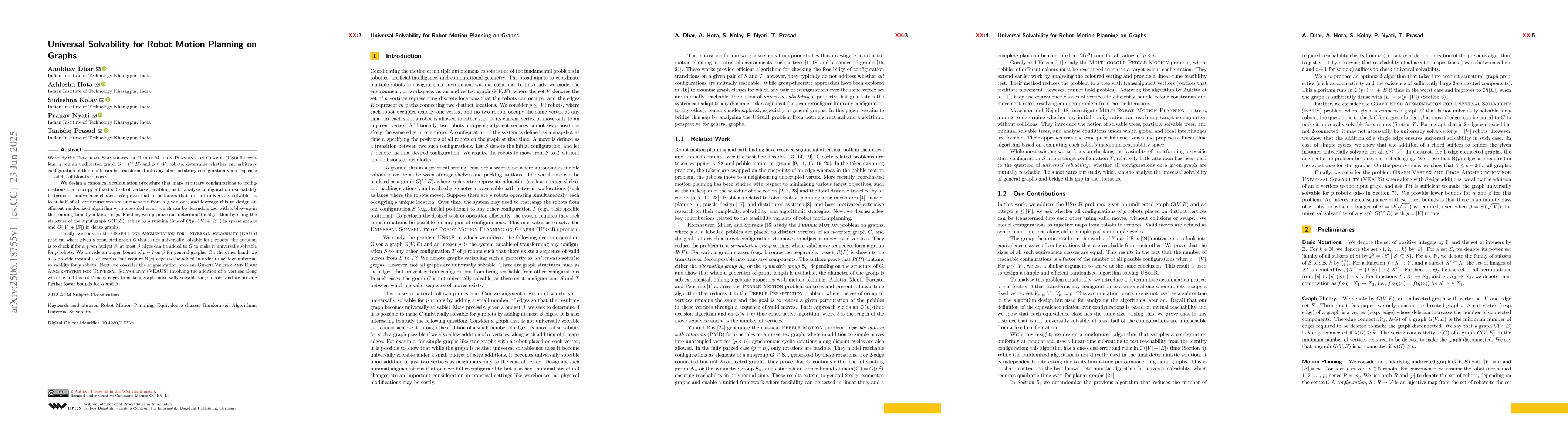 We study the Universal Solvability of Robot Motion Planning on Graphs (USolR) problem: given an undirected graph G = (V, E) and p robots, determine whether any arbitrary configuration of the robots can be transformed into any other arbitrary configuration via a sequence of valid, collision-free moves. We design a canonical accumulation procedure that maps arbitrary configurations to configurations that occupy a fixed subset of vertices, enabling us to analyze configuration reachability in terms of equivalence classes. We prove that in instances that are not universally solvable, at least half of all configurations are unreachable from a given one, and leverage this to design an efficient randomized algorithm with one-sided error, which can be derandomized with a blow-up in the running time by a factor of p. Further, we optimize our deterministic algorithm by using the structure of the input graph G = (V, E), achieving a running time of O(p * (|V| + |E|)) in sparse graphs and O(|V| + |E|) in dense graphs. Finally, we consider the Graph Edge Augmentation for Universal Solvability (EAUS) problem, where given a connected graph G that is not universally solvable for p robots, the question is to check if for a given budget b, at most b edges can be added to G to make it universally solvable for p robots. We provide an upper bound of p - 2 on b for general graphs. On the other hand, we also provide examples of graphs that require Theta(p) edges to be added. We further study the Graph Vertex and Edge Augmentation for Universal Solvability (VEAUS) problem, where a vertices and b edges can be added, and we provide lower bounds on a and b.