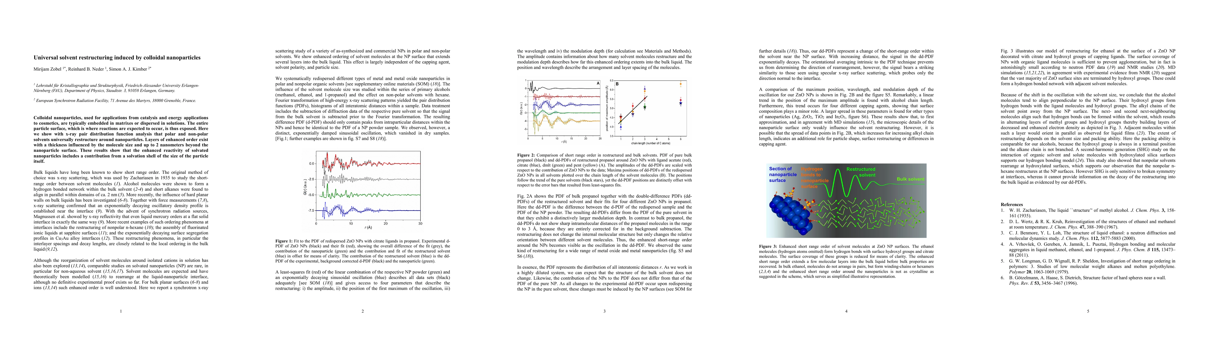 Colloidal nanoparticles, used for applications from catalysis and energy applications to cosmetics, are typically embedded in matrixes or dispersed in solutions. The entire particle surface, which is where reactions are expected to occur, is thus exposed. Here we show with x-ray pair distribution function analysis that polar and non-polar solvents universally restructure around nanoparticles. Layers of enhanced order exist with a thickness influenced by the molecule size and up to 2 nanometers beyond the nanoparticle surface. These results show that the enhanced reactivity of solvated nanoparticles includes a contribution from a solvation shell of the size of the particle itself.