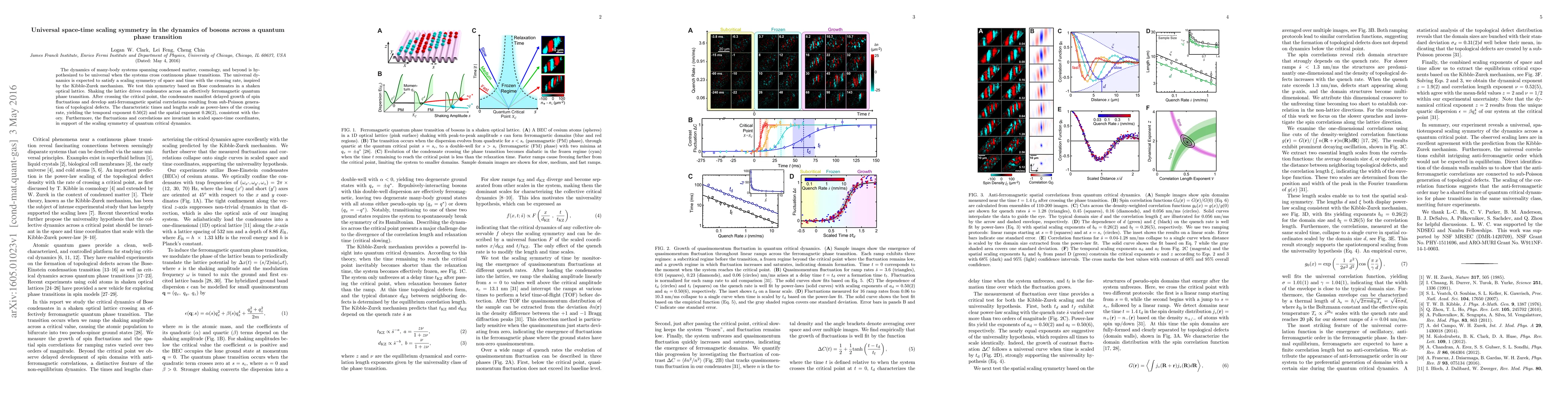 This research tests the universal space-time scaling symmetry in boson dynamics during quantum phase transitions, using Bose condensates in a shaken optical lattice. The findings show power-law scaling of characteristic times and lengths, with temporal exponent 0.50(2) and spatial exponent 0.26(2), supporting the Kibble-Zurek mechanism and scaling symmetry of quantum critical dynamics.