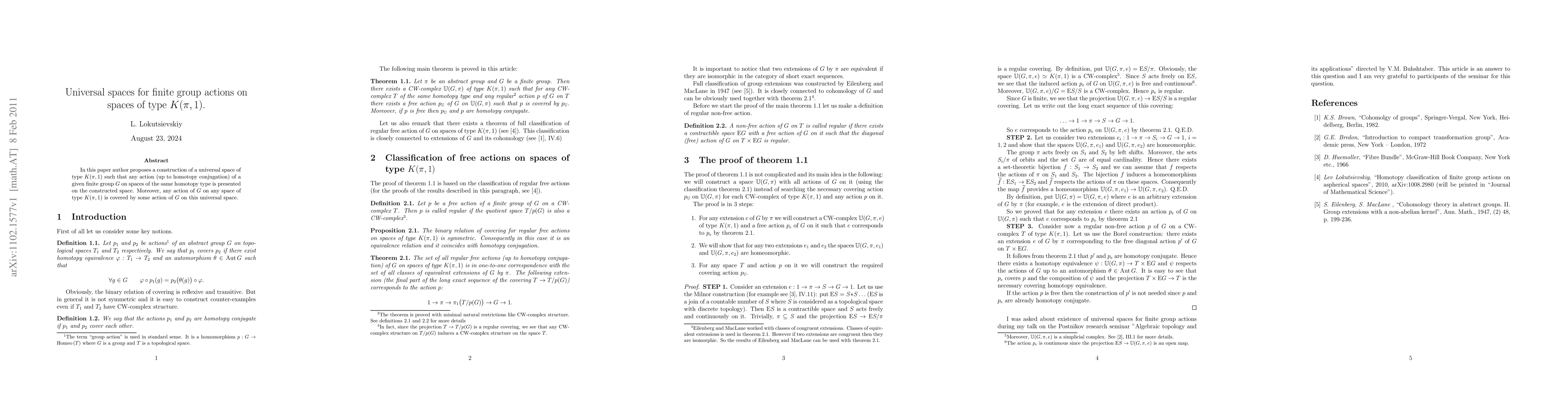In this paper author proposes a construction of a universal space of type $K(\pi,1)$ such that any action (up to homotopy conjugation) of a given finite group $G$ on spaces of the same homotopy type is presented on the constructed space. Moreover, any action of $G$ on any space of type $K(\pi,1)$ is covered by some action of $G$ on this universal space.
