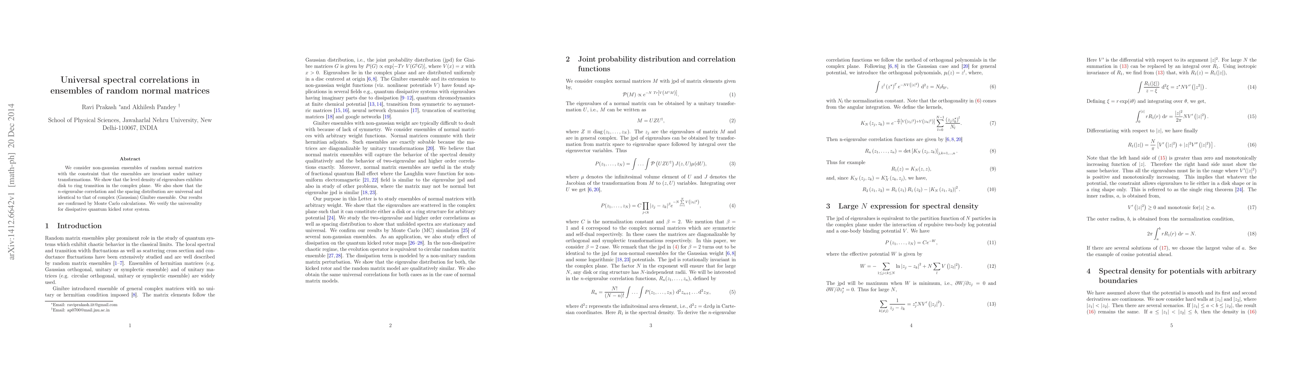 This paper demonstrates universal spectral correlations in non-Gaussian ensembles of random normal matrices, revealing a disk to ring transition in eigenvalue density and showing that these ensembles exhibit the same eigenvalue correlation and spacing distribution as Gaussian Ginibre ensembles, verified by Monte Carlo and quantum systems.