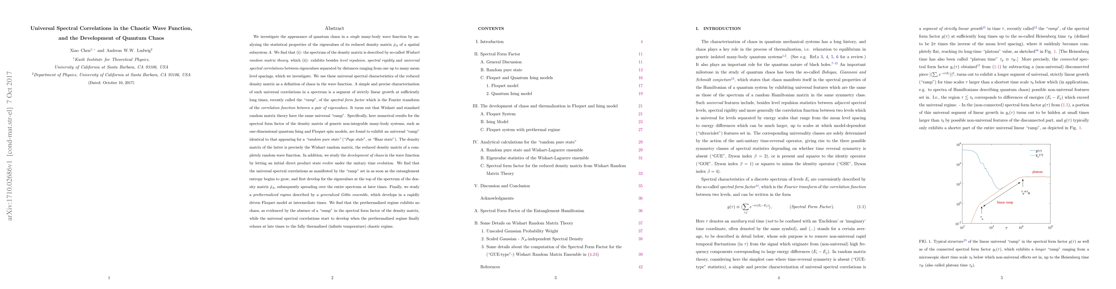 We investigate the appearance of quantum chaos in a single many-body wave function by analyzing the statistical properties of the eigenvalues of its reduced density matrix $\rho_A$ of a spatial subsystem A. We find that the spectrum of $\rho_A$ is described by a so-called Wishart random matrix, which exhibits universal spectral correlations between eigenvalues separated by distances ranging from one up to many mean level spacings. We use these universal spectral characteristics of $\rho_A$ as a definition of chaos in the wave function. A simple and precise characterization of such correlations is a segment of linear growth at sufficiently long times, recently called the "ramp", of the spectral form factor. Specifically, numerical results for the spectral form factor of $\rho_A$ of generic non-integrable systems, such as one-dimensional quantum Ising and Floquet spin models, are found to exhibit an universal ramp identical to that appearing for a random pure state, in which $\rho_A$ is the Wishart random matrix. In addition, we study the development of chaos in the wave function by letting an initial direct product state evolve under the unitary time evolution. We find that the universal spectral correlations as manifested by the ramp set in as soon as the entanglement entropy begins to grow, and first develop for the eigenvalues at the top of the spectrum of $\rho_A$, subsequently spreading over the entire spectrum at later times. Finally, we study a prethermalized regime described by a generalized Gibbs ensemble, which develops in a rapidly driven Floquet model at intermediate times. We find that the prethermalized regime exhibits no chaos, as evidenced by the absence of a ramp in the spectral form factor of $\rho_A$, while the universal spectral correlations start to develop when the prethermalized regime finally relaxes at late times to the fully thermalized chaotic regime.