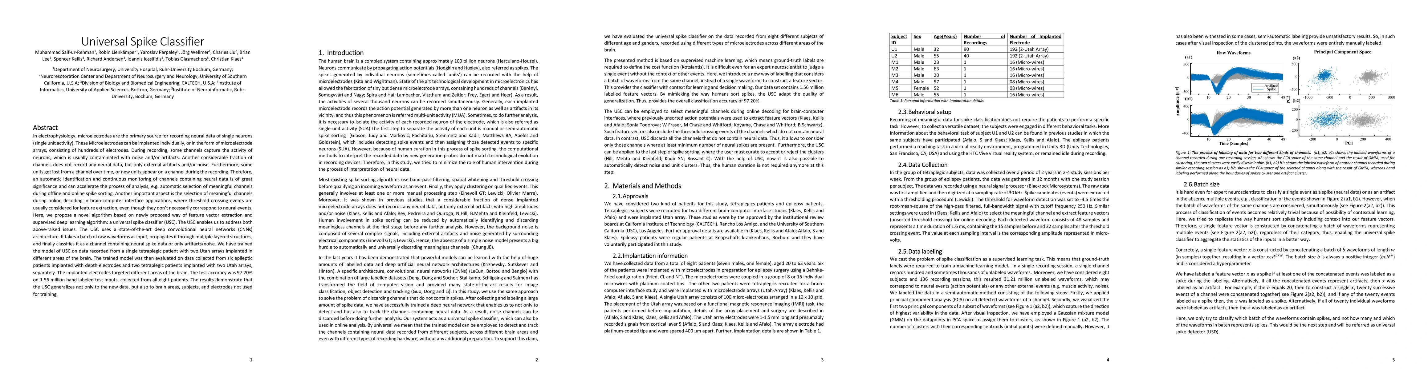 The Universal Spike Classifier (USC) is a novel convolutional neural network algorithm designed to automatically identify and track channels in microelectrode recordings that contain neural spike data, distinguishing them from noise and artifacts. This method was trained on data from a tetraplegic patient and successfully evaluated on data from multiple other patients.