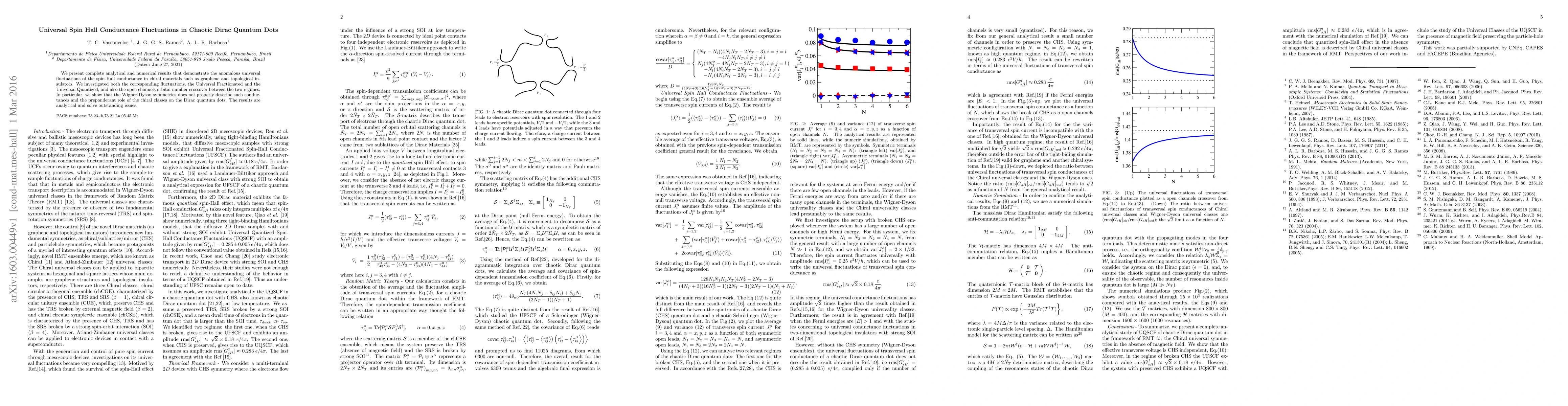 This paper presents comprehensive analytical and numerical evidence of universal spin-Hall conductance fluctuations in chiral materials like graphene and topological insulators, revealing that the Wigner-Dyson symmetries do not adequately describe these fluctuations, emphasizing the significant role of chiral classes in Dirac quantum dots.
