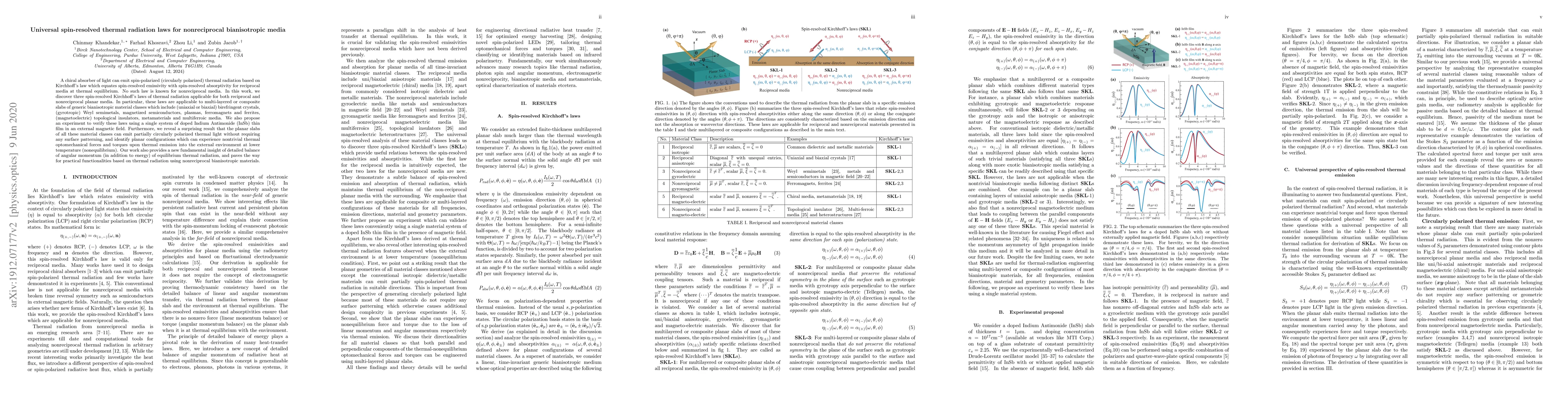 This paper discovers three spin-resolved Kirchhoff's laws of thermal radiation applicable to both reciprocal and nonreciprocal bianisotropic media, including various materials like birefringent crystals and metamaterials. It proposes an experiment to verify these laws using doped Indium Antimonide thin films and reveals that these materials can emit partially circularly polarized thermal light without surface patterning.