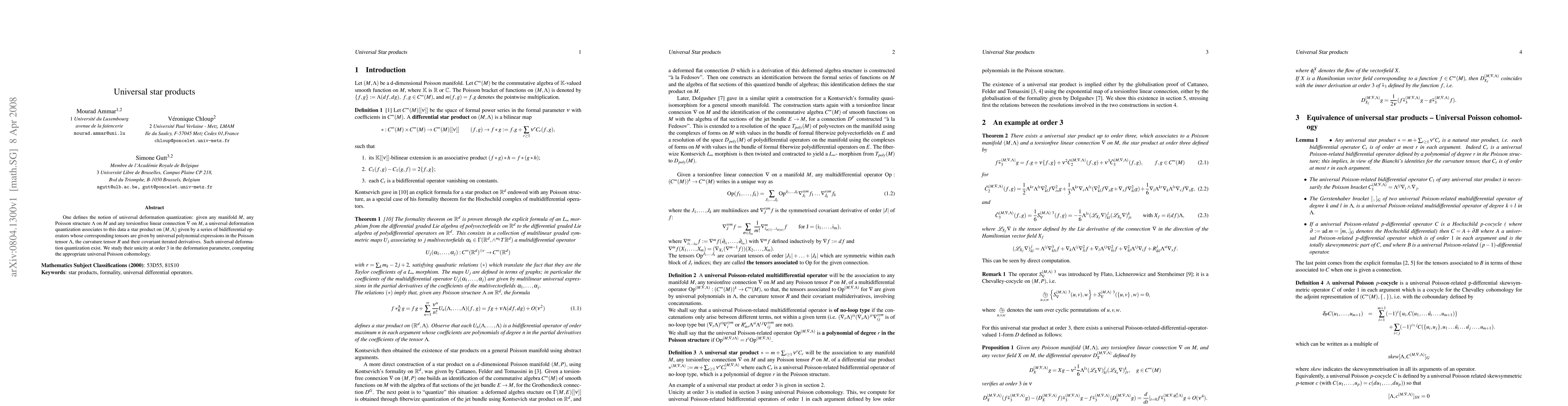 One defines the notion of universal deformation quantization: given any manifold $M$, any Poisson structure $\P$ on $M$ and any torsionfree linear connection $\nabla$ on $M$, a universal deformation quantization associates to this data a star product on $(M,\P)$ given by a series of bidifferential operators whose corresponding tensors are given by universal polynomial expressions in the Poisson tensor $\P$, the curvature tensor $R$ and their covariant iterated derivatives. Such universal deformation quantization exist. We study their unicity at order 3 in the deformation parameter, computing the appropriate universal Poisson cohomology.
