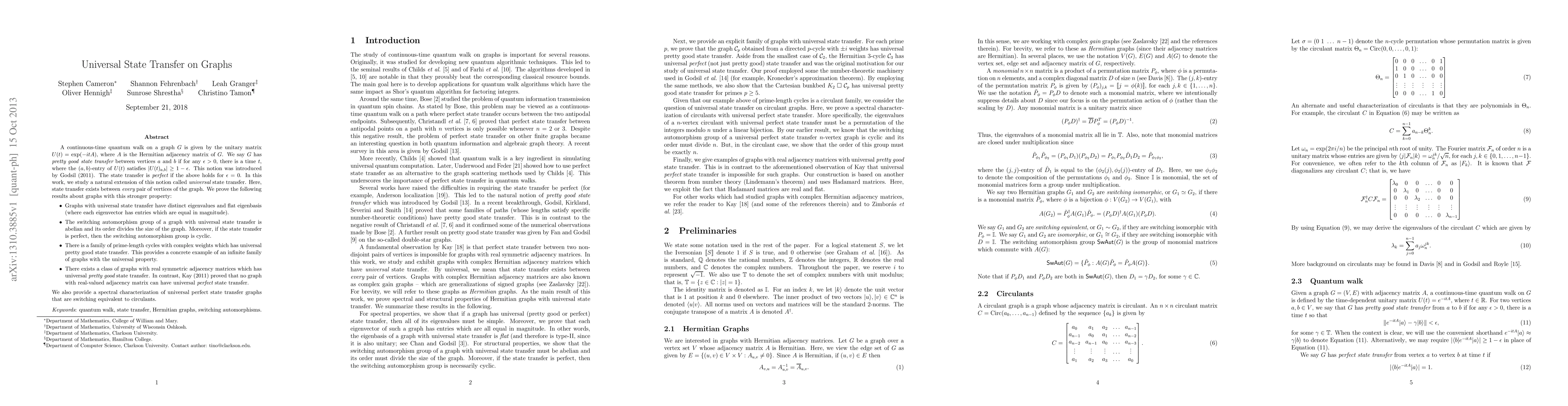 Researchers studied graphs with universal state transfer, a property where every pair of vertices can transfer information perfectly, and found that such graphs have distinct eigenvalues and specific symmetry properties.
