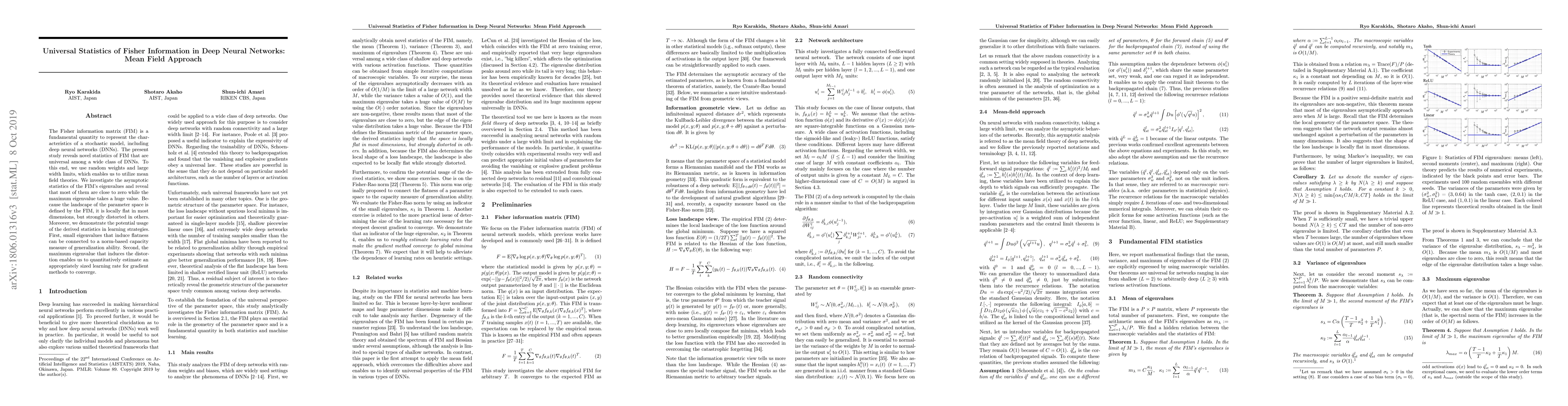 The Fisher information matrix (FIM) is a fundamental quantity to represent the characteristics of a stochastic model, including deep neural networks (DNNs). The present study reveals novel statistics of FIM that are universal among a wide class of DNNs. To this end, we use random weights and large width limits, which enables us to utilize mean field theories. We investigate the asymptotic statistics of the FIM's eigenvalues and reveal that most of them are close to zero while the maximum eigenvalue takes a huge value. Because the landscape of the parameter space is defined by the FIM, it is locally flat in most dimensions, but strongly distorted in others. Moreover, we demonstrate the potential usage of the derived statistics in learning strategies. First, small eigenvalues that induce flatness can be connected to a norm-based capacity measure of generalization ability. Second, the maximum eigenvalue that induces the distortion enables us to quantitatively estimate an appropriately sized learning rate for gradient methods to converge.