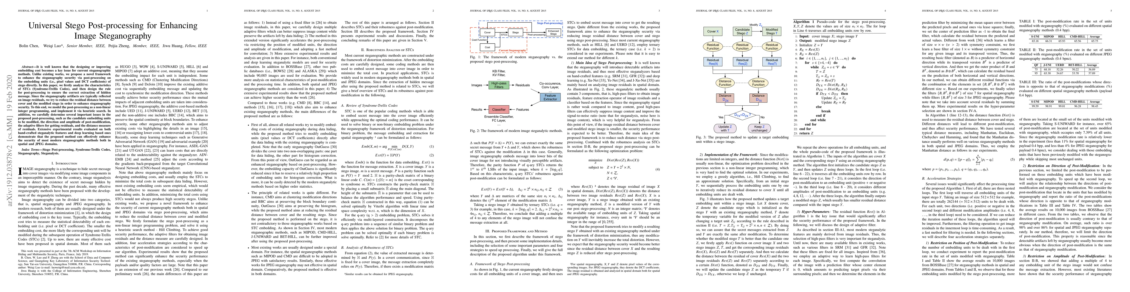 This paper proposes a novel post-processing framework to enhance steganography security by modifying embedding units directly. The method reduces residual distance between cover and stego images, modeled as a non-linear integer programming problem, and is shown to improve security across various steganographic methods.