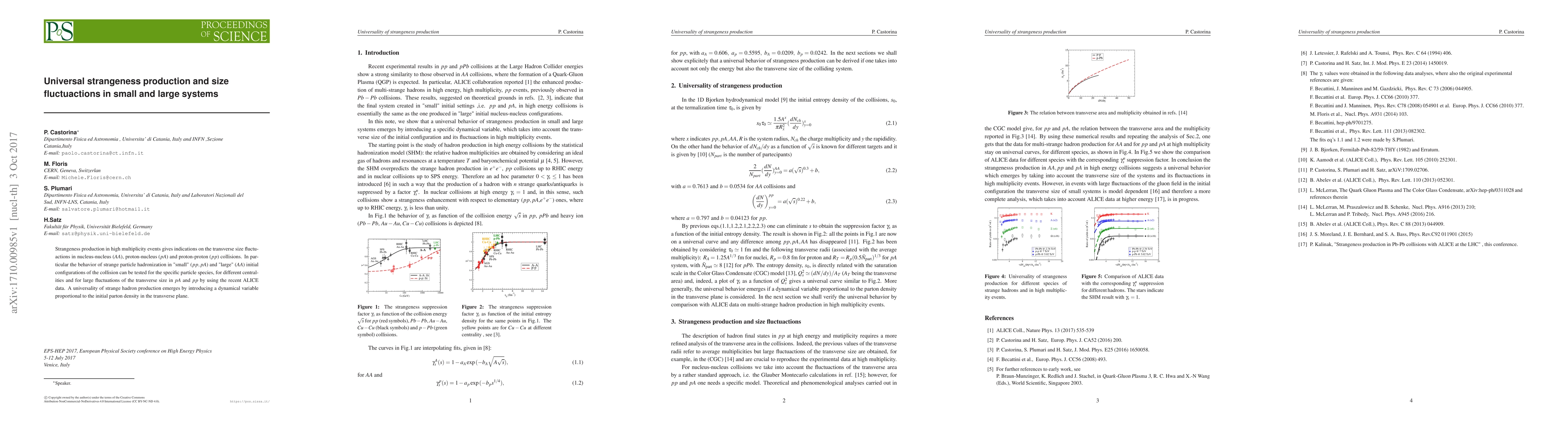 Strangeness production in high multiplicity events gives indications on the transverse size fluctuactions in nucleus-nucleus ($AA$), proton-nucleus ($pA$) and proton-proton ($pp$) collisions. In particular the behavior of strange particle hadronization in "small" ($pp,pA$) and "large" ($AA$) initial configurations of the collision can be tested for the specific particle species, for different centralities and for large fluctuations of the transverse size in $pA$ and $pp$ by using the recent ALICE data. A universality of strange hadron production emerges by introducing a dynamical variable proportional to the initial parton density in the transverse plane.