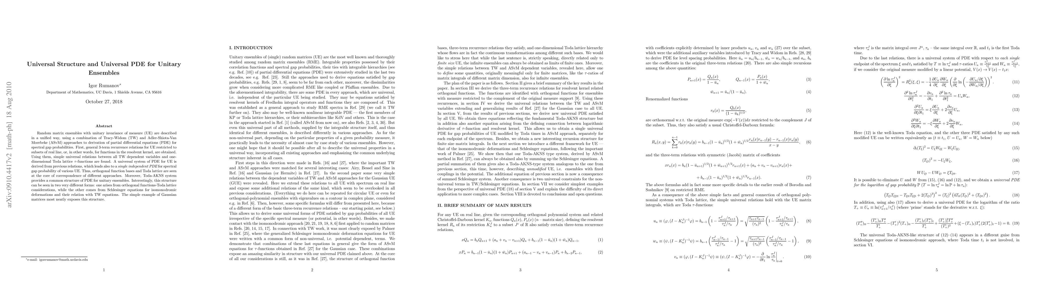 An attempt is made to describe random matrix ensembles with unitary invariance of measure (UE) in a unified way, using a combination of Tracy-Widom (TW) and Adler-Shiota-Van Moerbeke (ASvM) approaches to derivation of partial differential equations (PDE) for spectral gap probabilities. First, general 3-term recurrence relations for UE restricted to subsets of real line, or, in other words, for functions in the resolvent kernel, are obtained. Using them, simple universal relations between all TW dependent variables and one-dimensional Toda lattice $\tau$-functions are found. A universal system of PDE for UE is derived from previous relations, which leads also to a {\it single independent PDE} for spectral gap probability of various UE. Thus, orthogonal function bases and Toda lattice are seen at the core of correspondence of different approaches. Moreover, Toda-AKNS system provides a common structure of PDE for unitary ensembles. Interestingly, this structure can be seen in two very different forms: one arises from orthogonal functions-Toda lattice considerations, while the other comes from Schlesinger equations for isomonodromic deformations and their relation with TW equations. The simple example of Gaussian matrices most neatly exposes this structure.