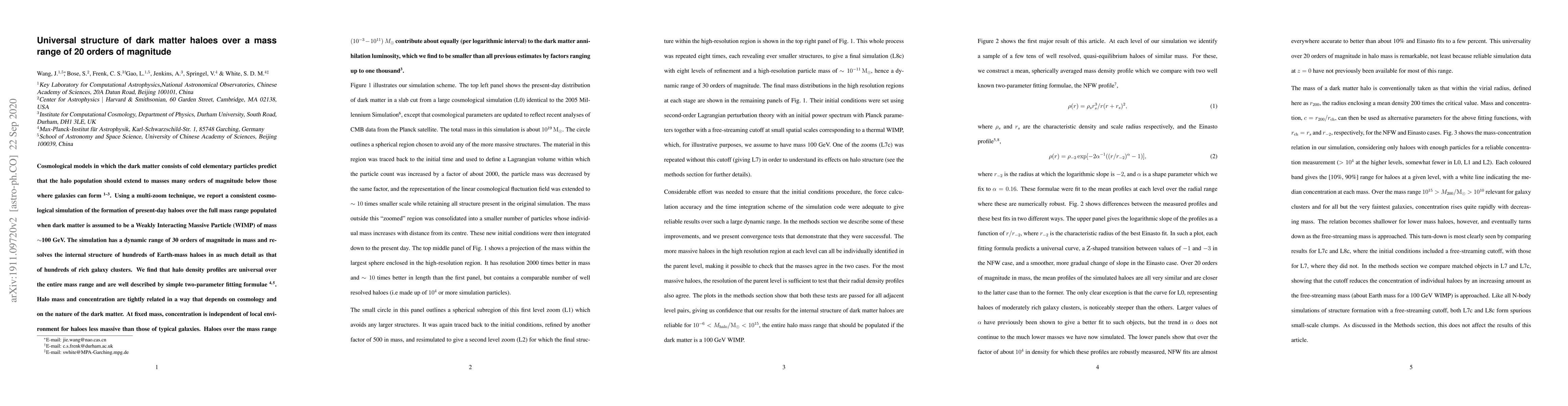 This paper reports a cosmological simulation revealing the universal density profiles of dark matter haloes spanning 20 orders of magnitude in mass, showing that these profiles are consistent across the entire mass range and can be described by simple fitting formulae. The study also finds that halo mass and concentration are closely related and that the expected dark matter annihilation luminosity is significantly lower than previous estimates.