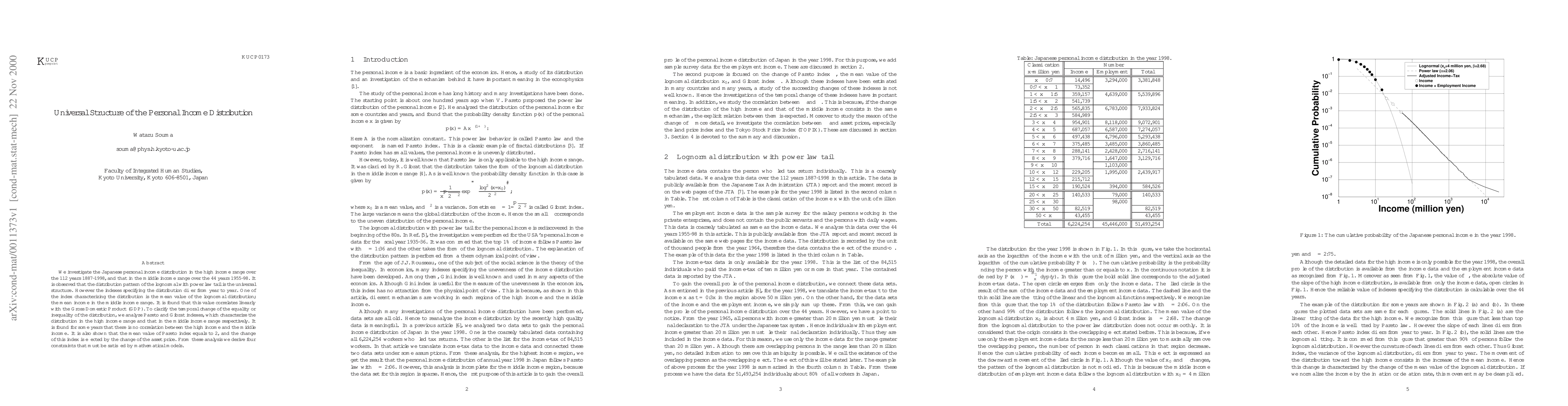 A study found that personal income distribution in Japan follows a universal lognormal pattern with power law tails, but its characteristics can change over time. The analysis revealed correlations between GDP and middle-income distribution, as well as changes in inequality patterns influenced by asset prices.