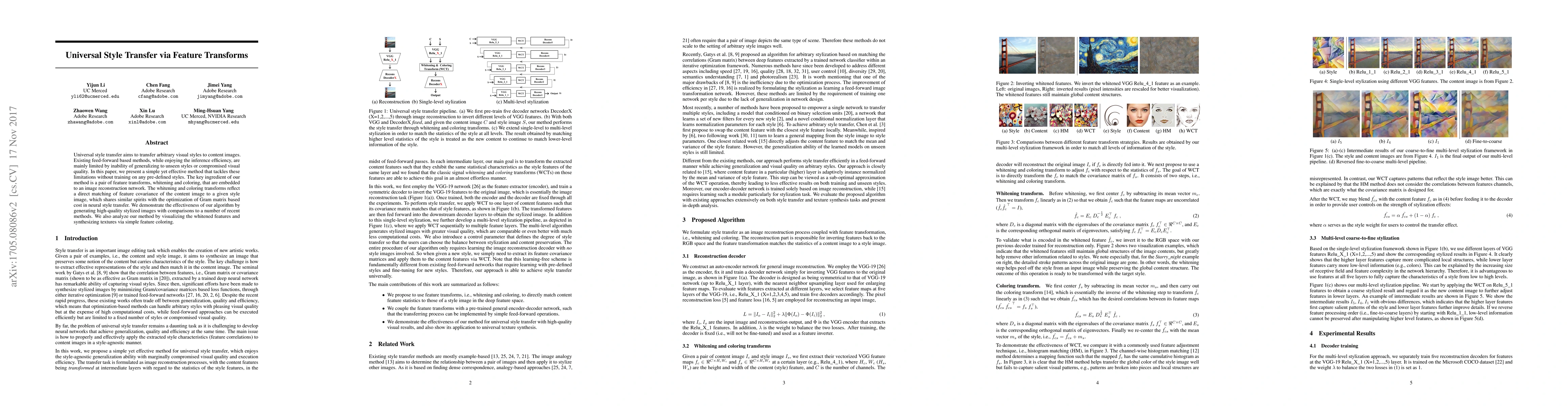 This paper proposes a novel method for universal style transfer using feature transforms—whitening and coloring—embedded in an image reconstruction network. Unlike existing feed-forward methods, this approach generalizes to unseen styles without training on pre-defined styles, achieving high-quality stylized images.