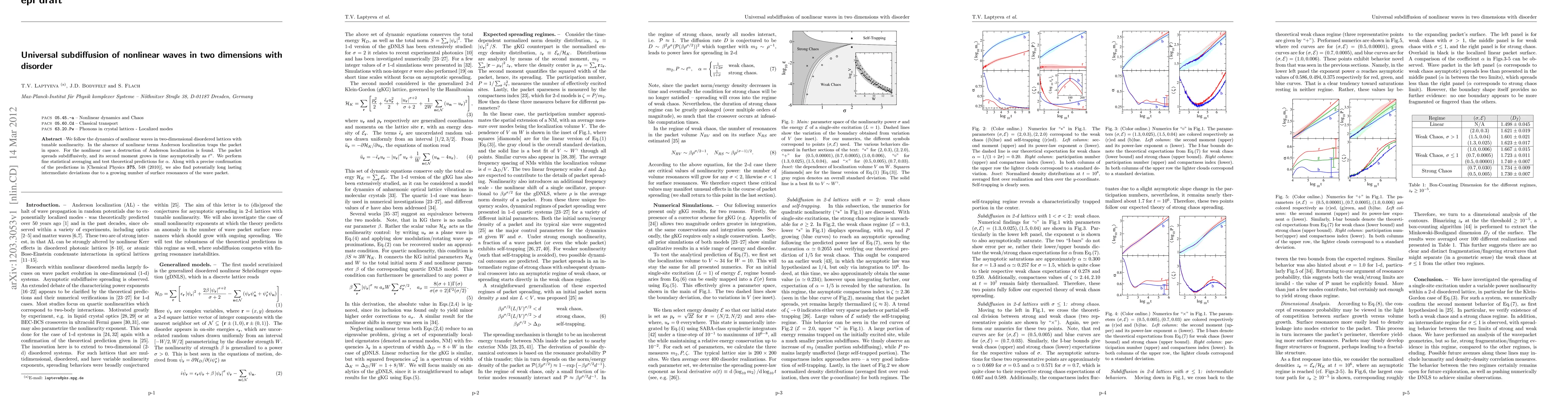 This paper investigates nonlinear wave dynamics in two-dimensional disordered lattices, revealing subdiffusion in the presence of nonlinearity, with the second moment growing as $t^\alpha$. It confirms theoretical predictions for $\alpha$ and identifies long-lasting intermediate deviations due to wave packet resonances.